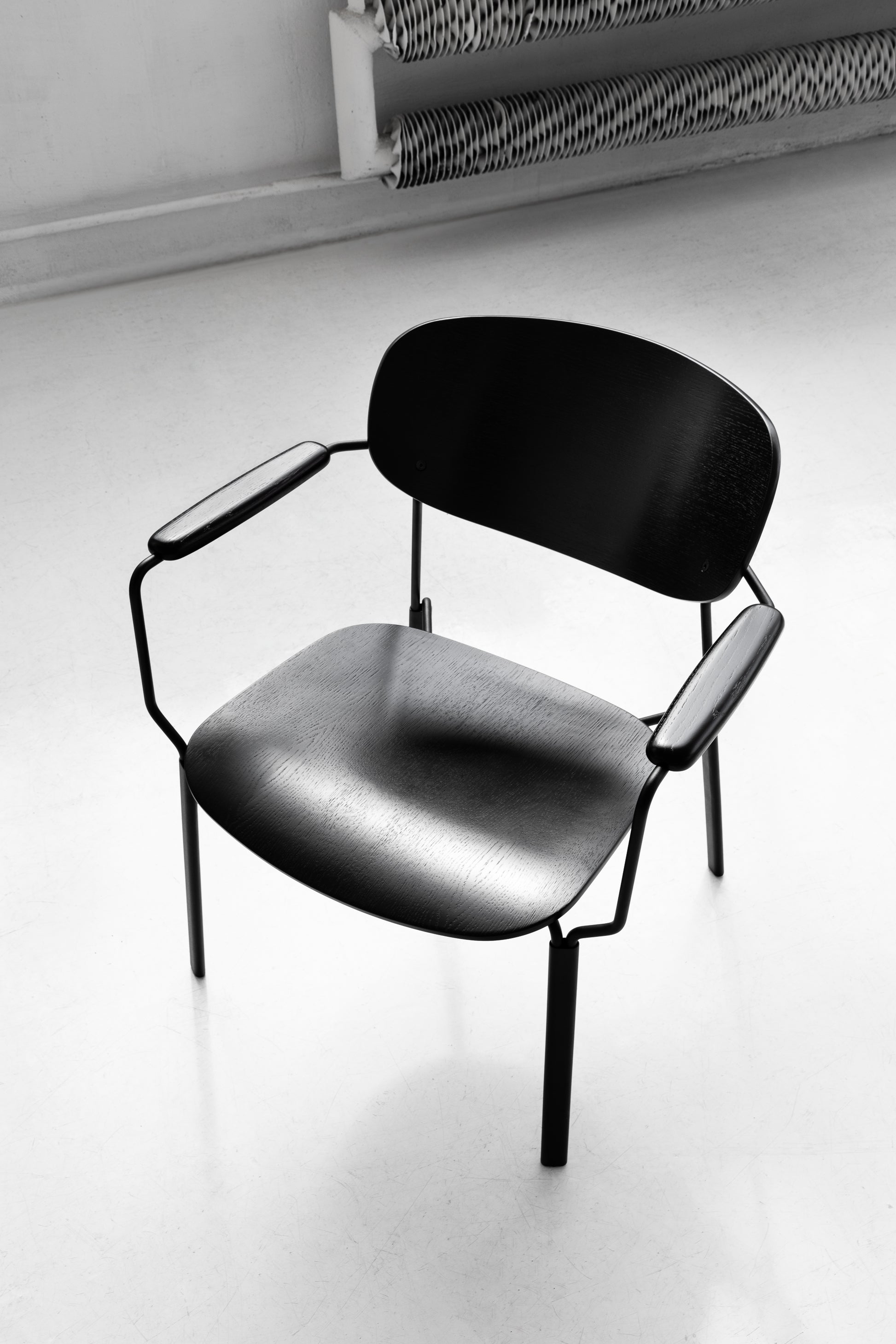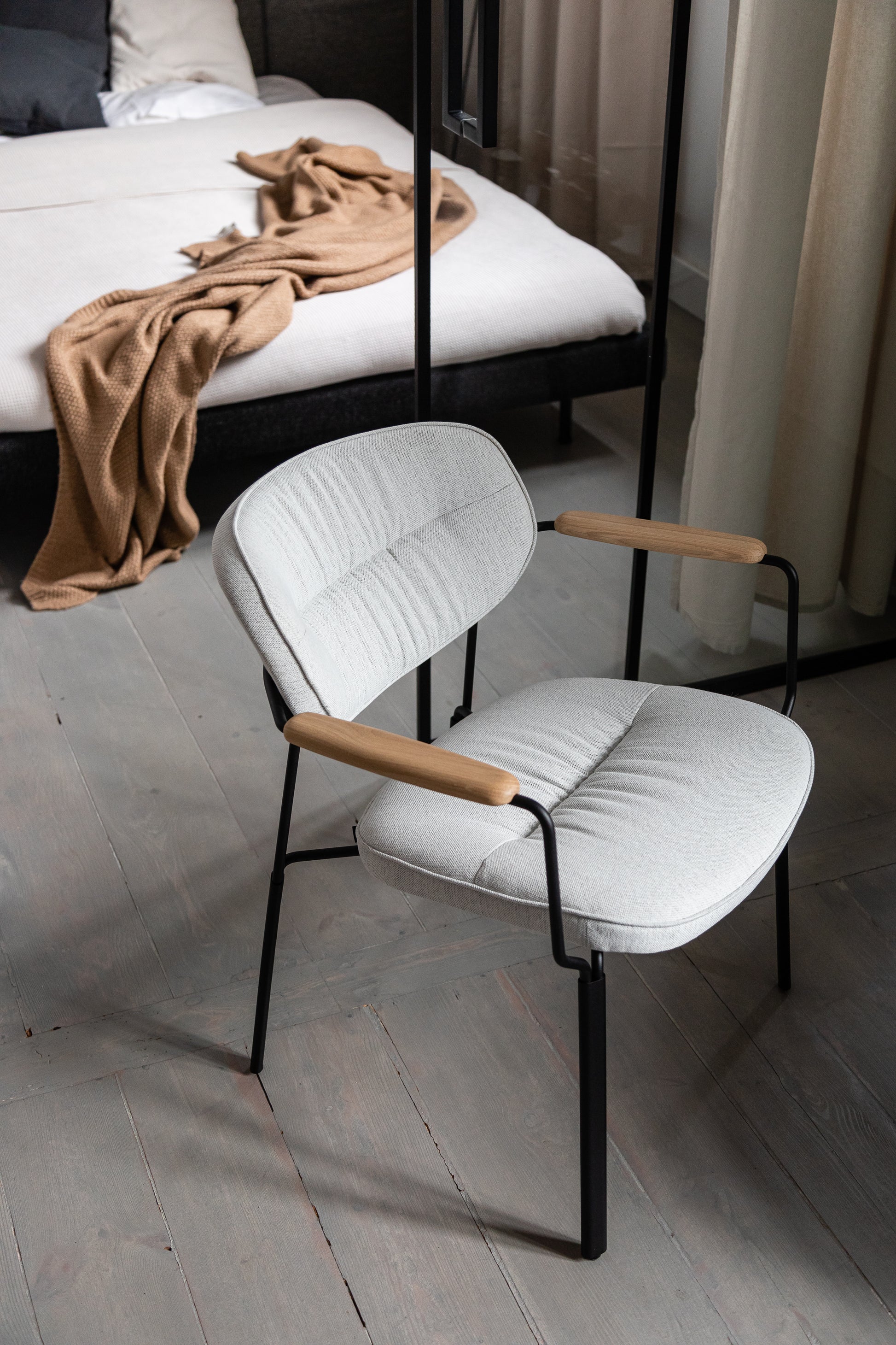 Sowohl der Algo-Sessel als auch der Algo-Stuhl sind in zwei Ausführungen erhältlich: Buchenholz-Sperrholz mit Eichenfurnier (und Eichenarmlehnen, stets in der Furnierfarbe) und gepolstert (ebenfalls mit Eichenarmlehnen). Dank einer breiten Auswahl an Stoffen und Oberflächenmaterialien fertigt Noti wahrhaft außergewöhnliche Produkte.