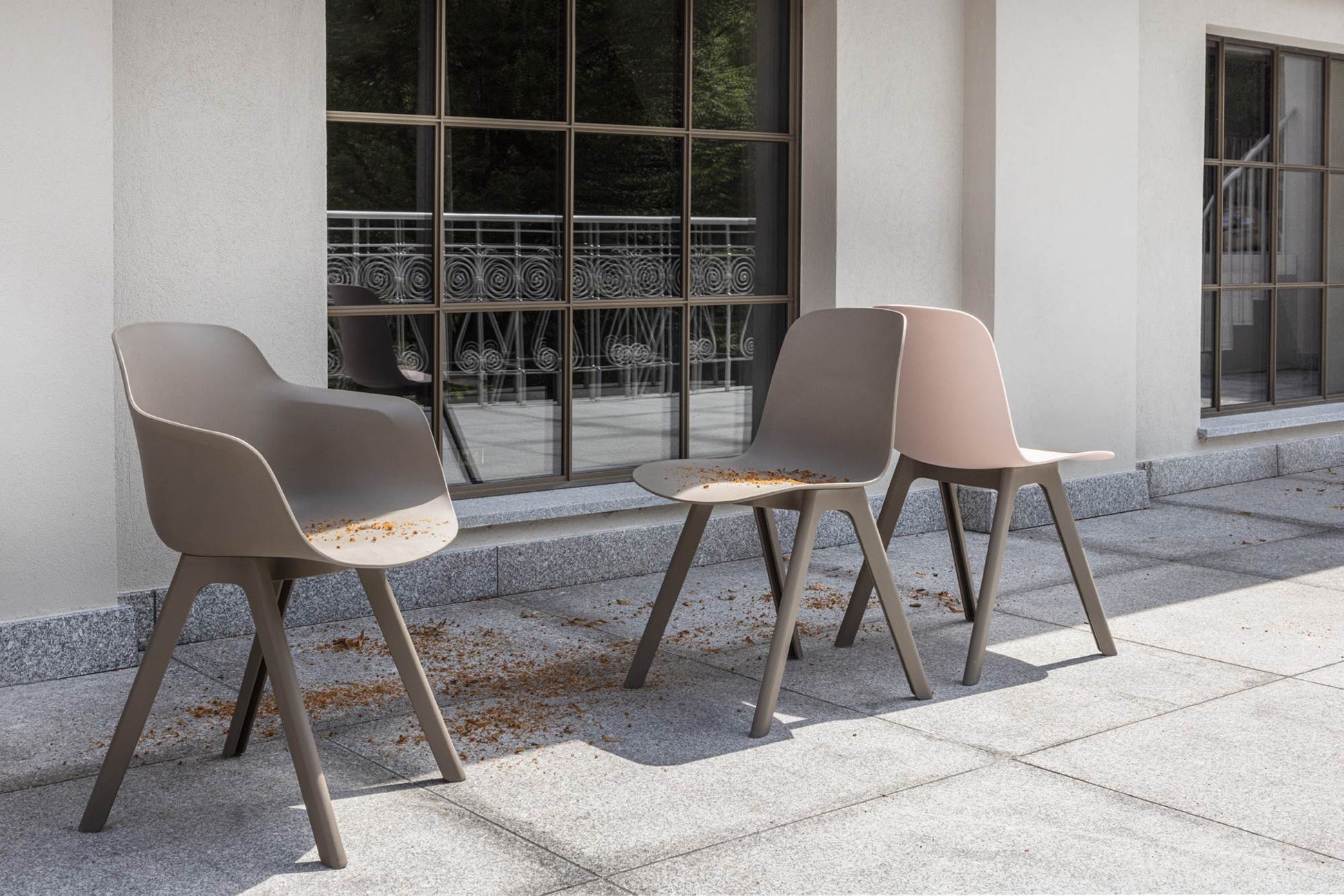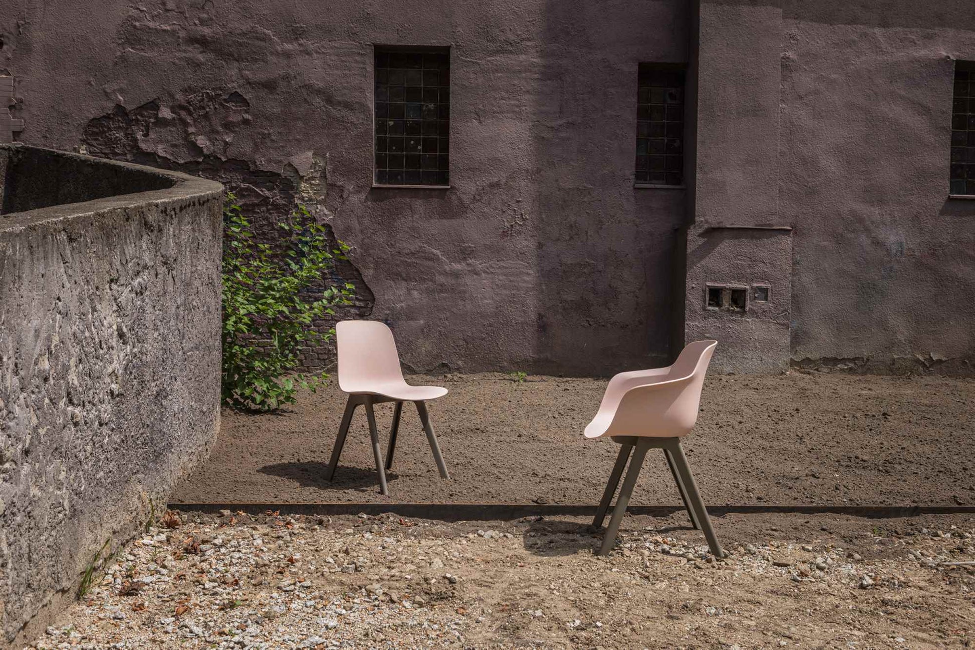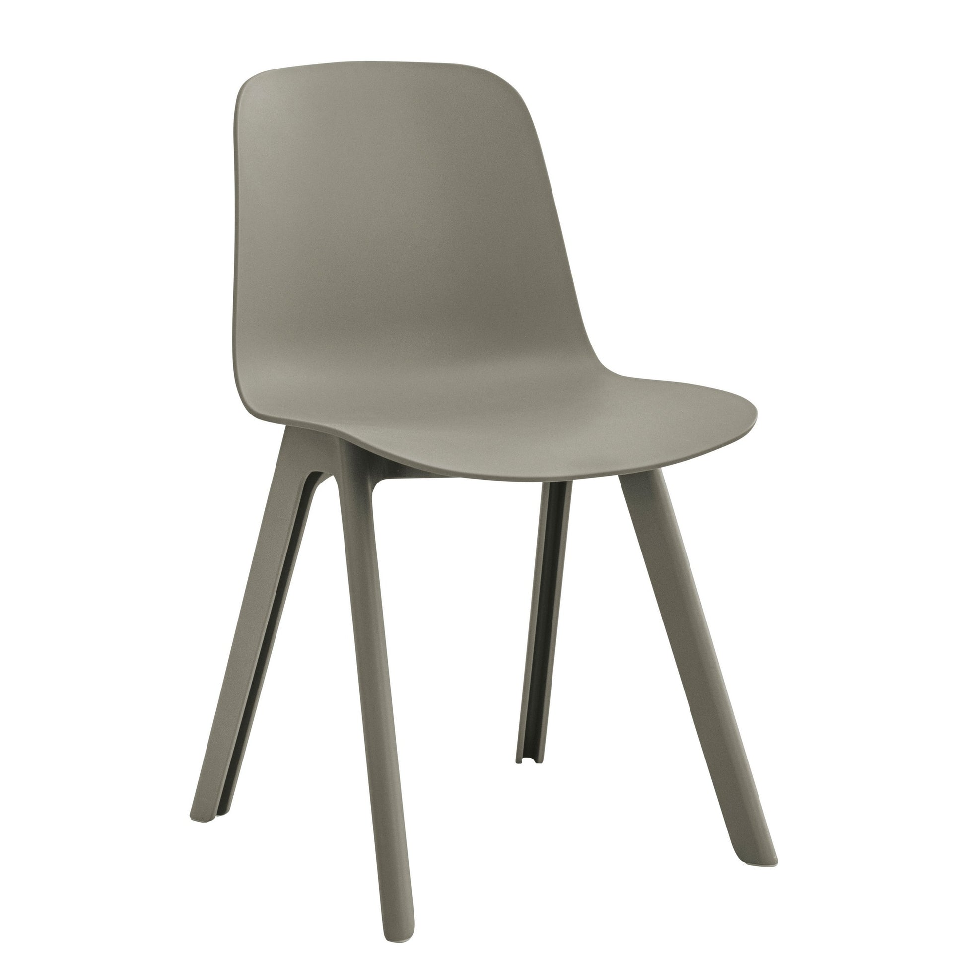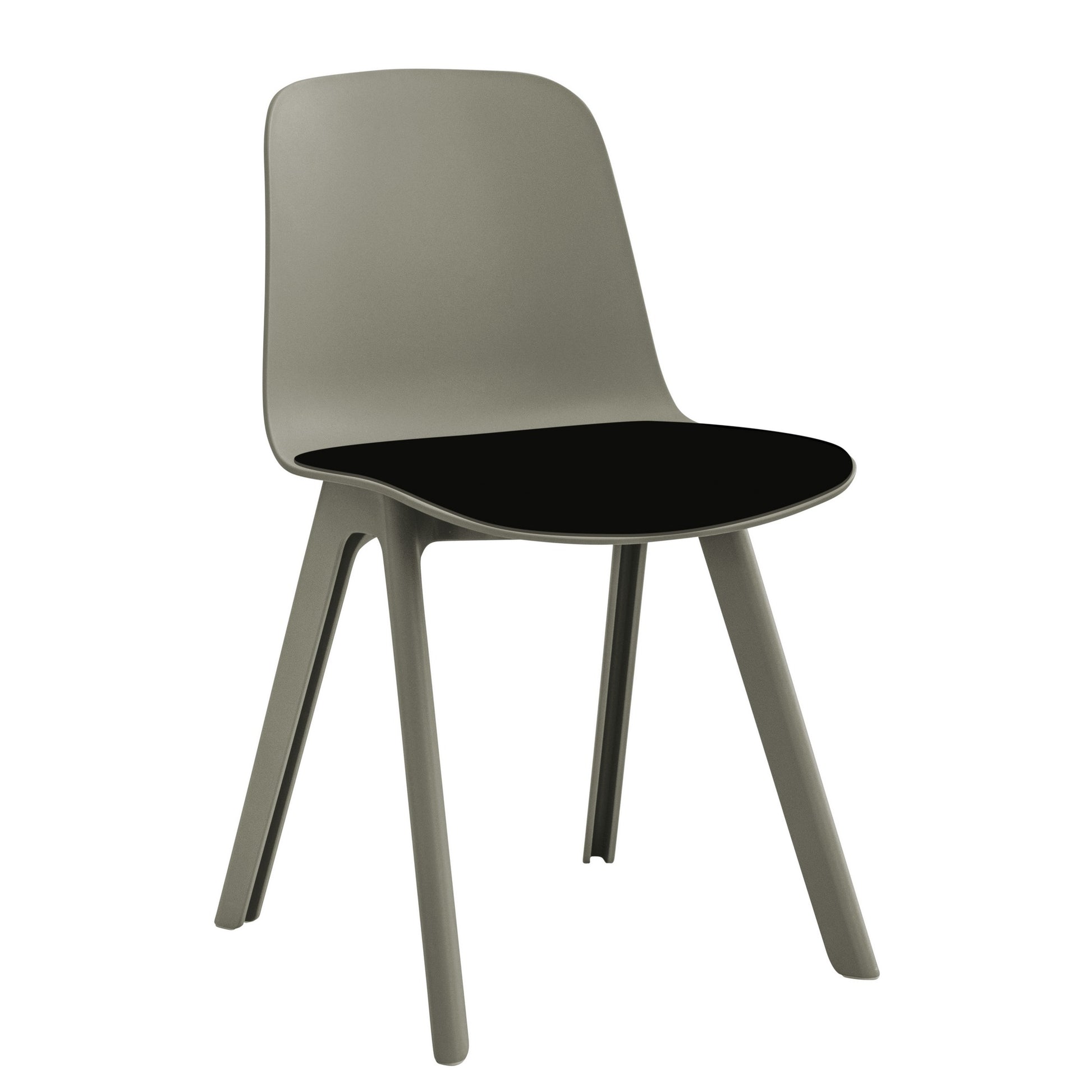 Die Kollektion umfasst Stühle mit zwei Sitzvarianten: einen Schalensitz, der den Benutzer an drei Seiten umschließt, und einen schmaleren Sitz ohne Armlehnen. Beide Ausführungen sind optional mit einem gepolsterten Sitzkissen erhältlich. Die Grundkonstruktion vereint Leichtigkeit und Langlebigkeit. Die erdgraue Variante besteht zu 100 Prozent aus recyceltem Kunststoff, genauer gesagt aus 50 Prozent recycelten Industrieabfällen und 50 Prozent Haushaltsabfällen.