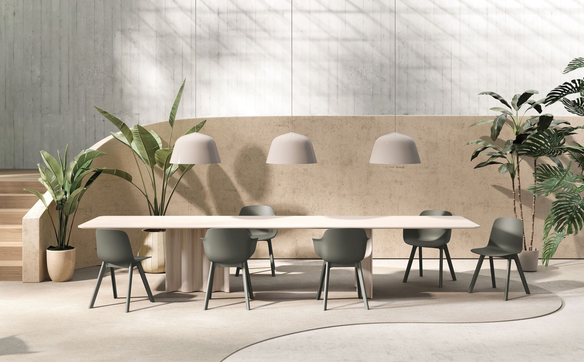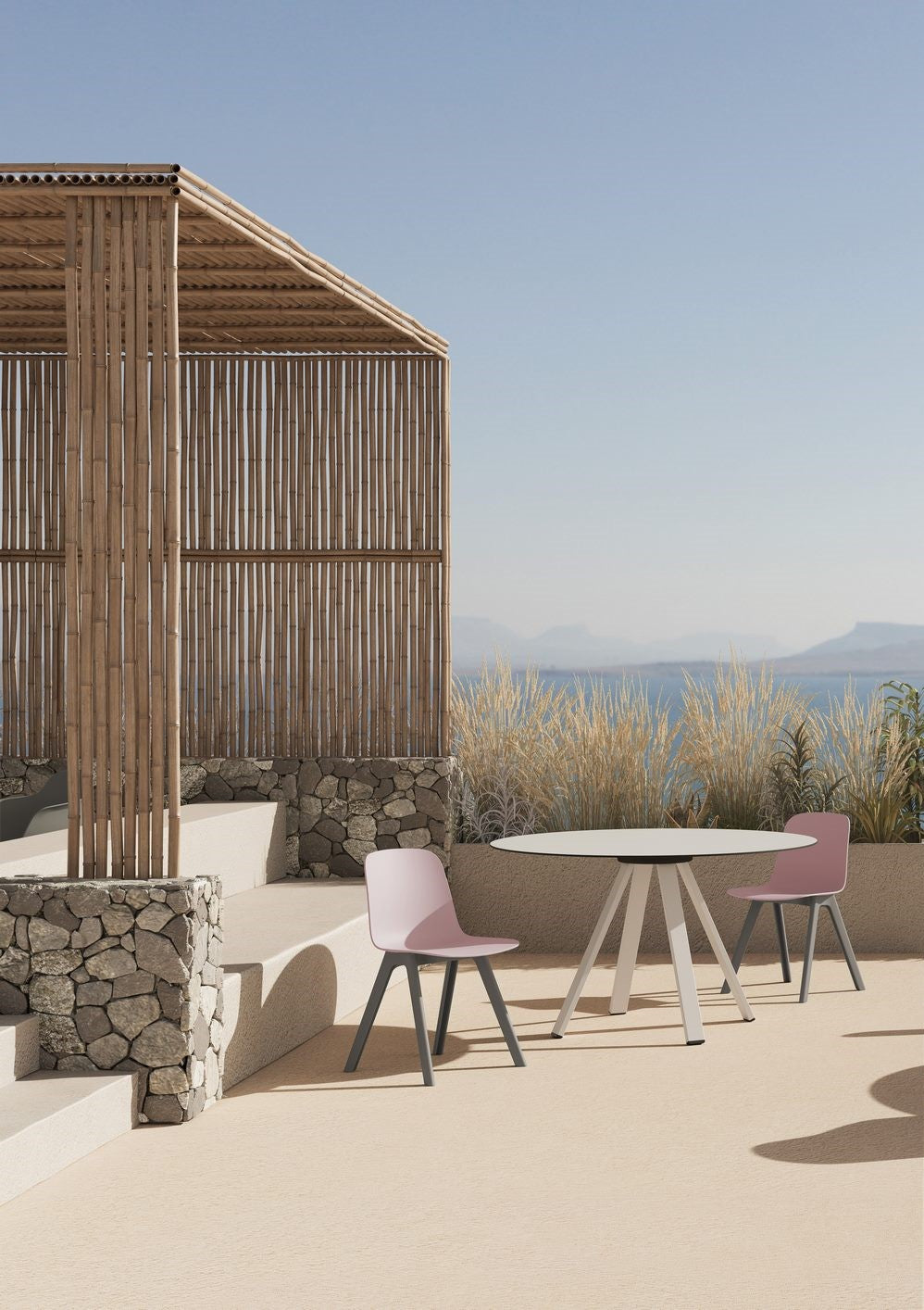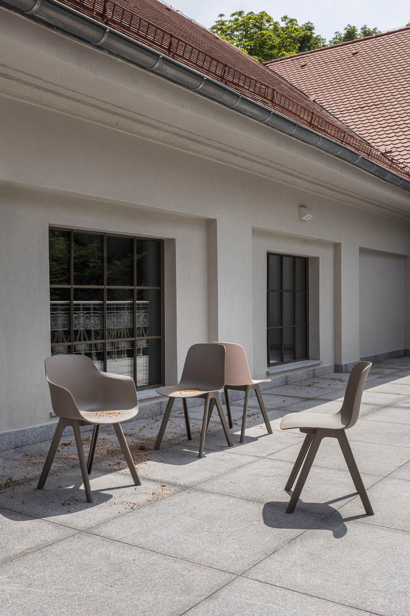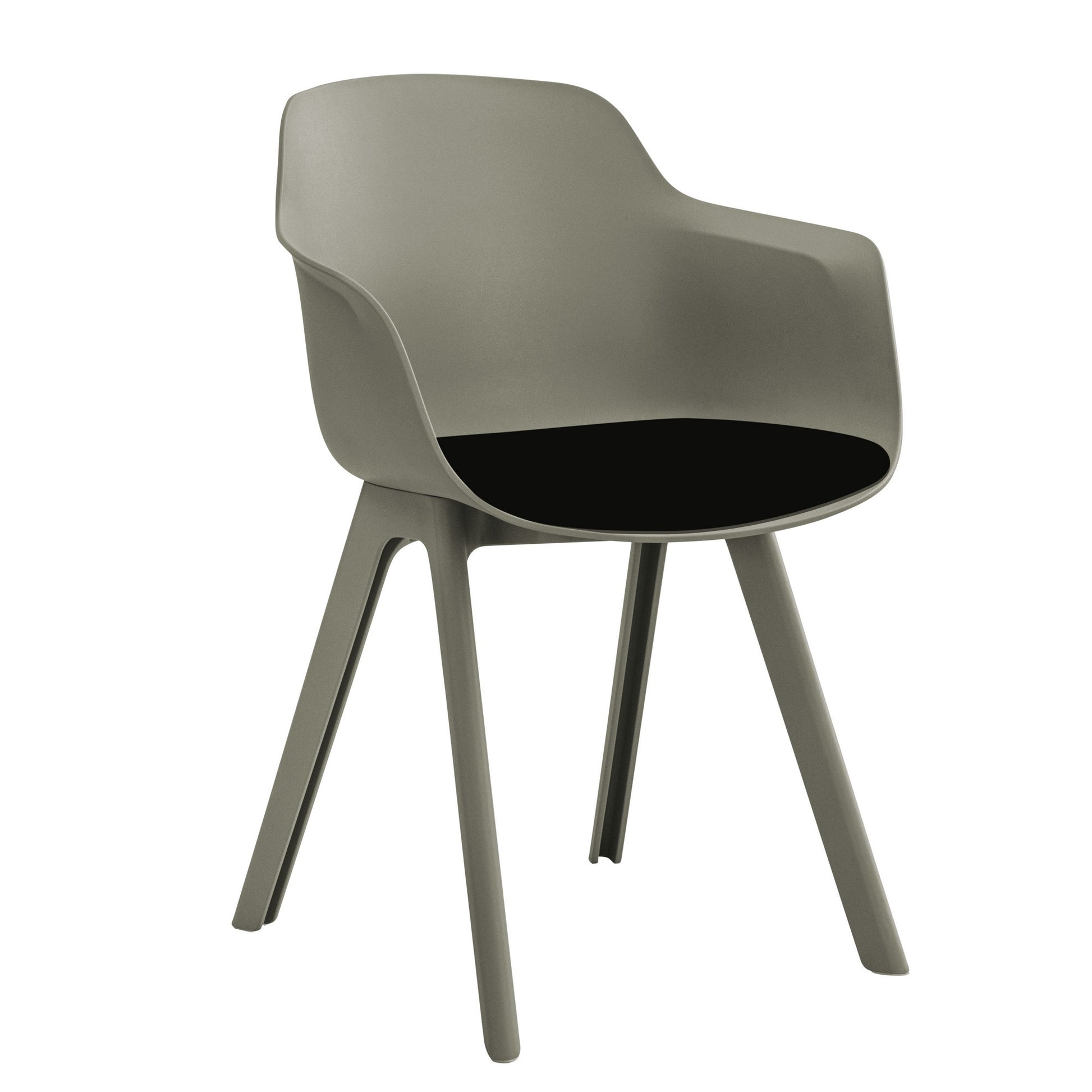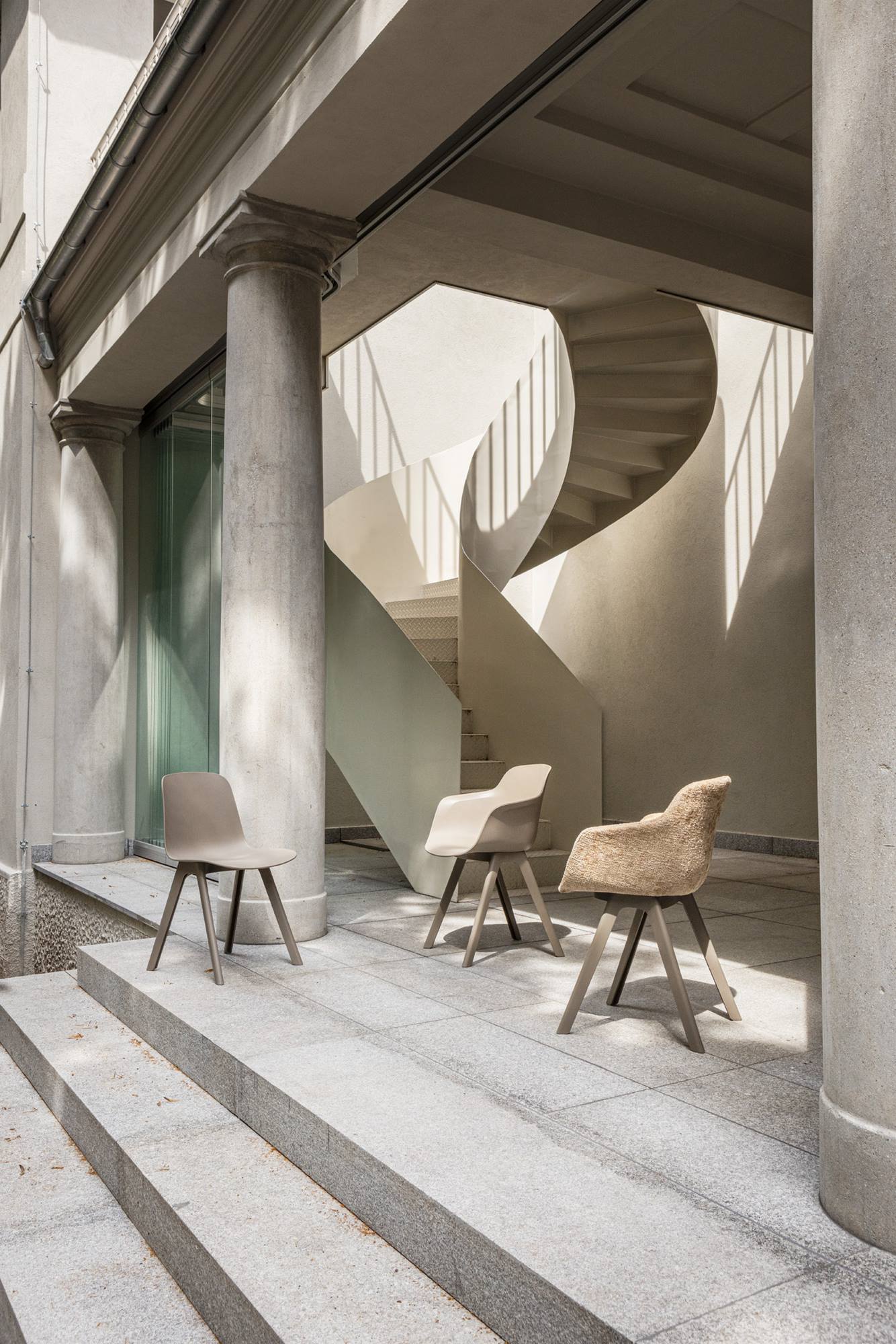 Die Kollektion umfasst Stühle mit zwei Sitzvarianten: einen Schalensitz, der den Benutzer an drei Seiten umschließt, und einen schmaleren Sitz ohne Armlehnen. Beide Ausführungen sind optional mit einem gepolsterten Sitzkissen erhältlich. Die Grundkonstruktion vereint Leichtigkeit und Langlebigkeit. Die erdgraue Variante besteht zu 100 Prozent aus recyceltem Kunststoff, genauer gesagt aus 50 Prozent recycelten Industrieabfällen und 50 Prozent Haushaltsabfällen.