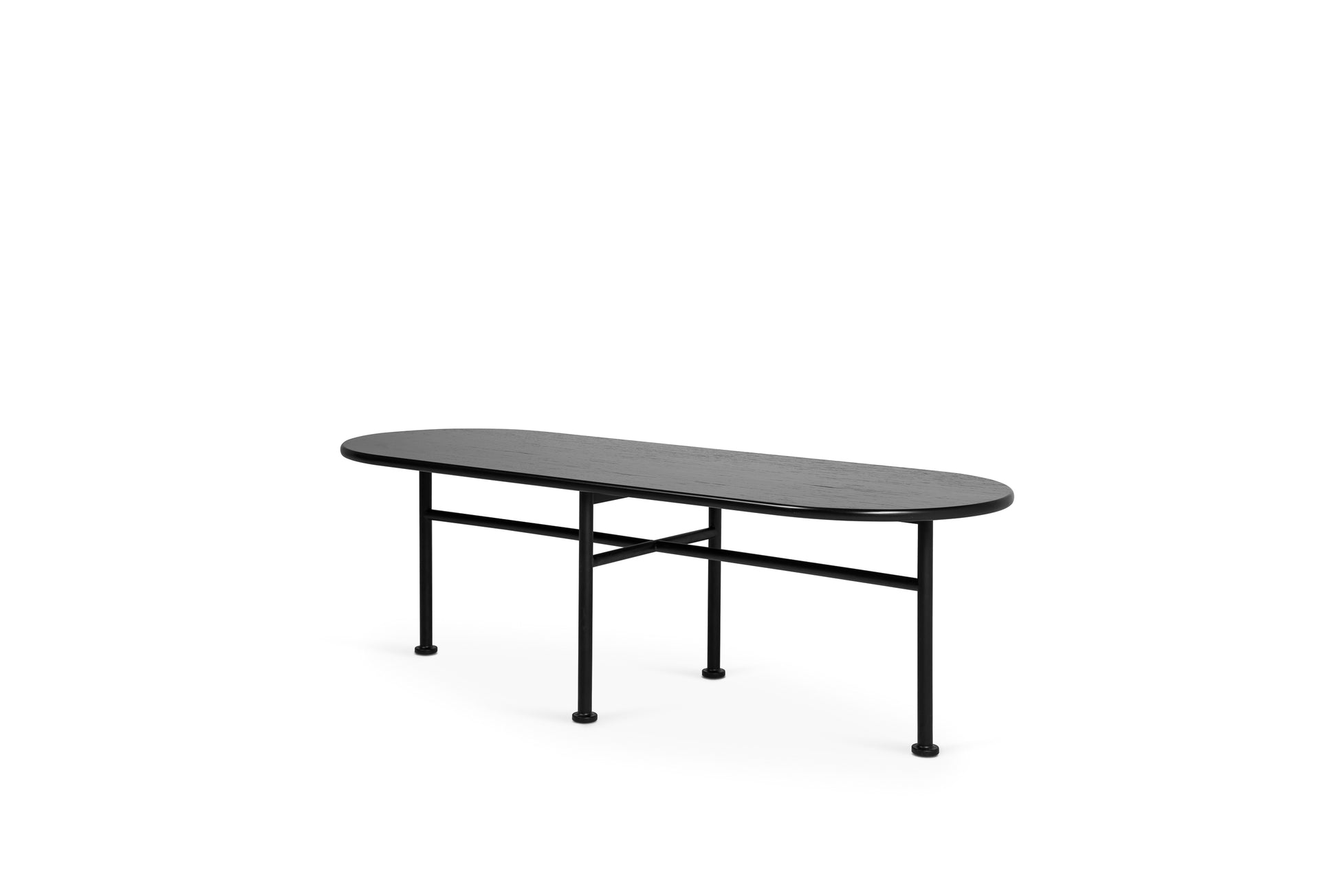 Die Sitze stehen auf Beinen aus naturbelassenem Eichenholz oder schwarz lackiertem Stahl.