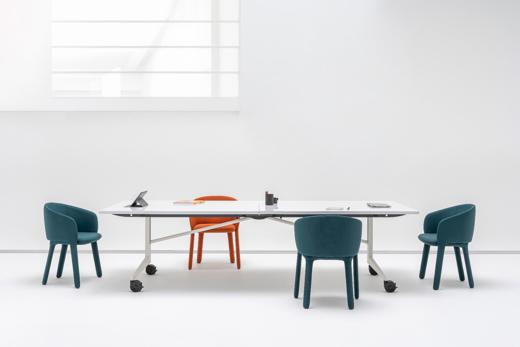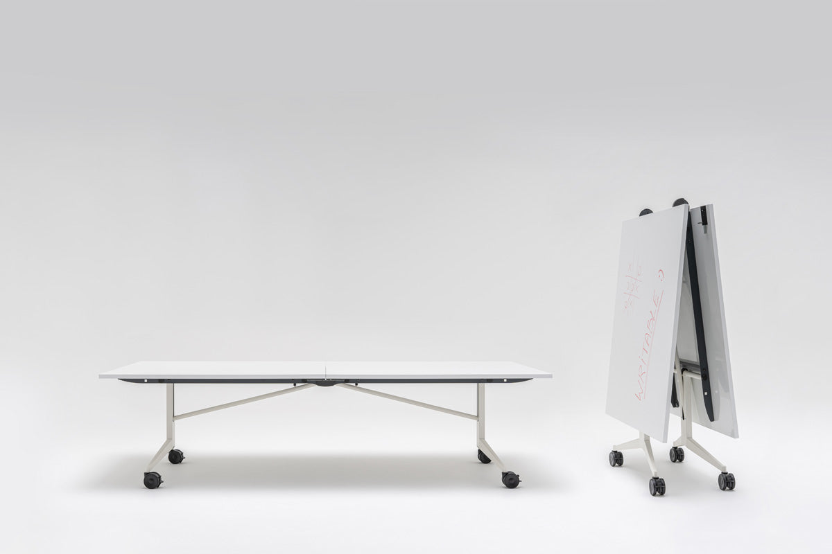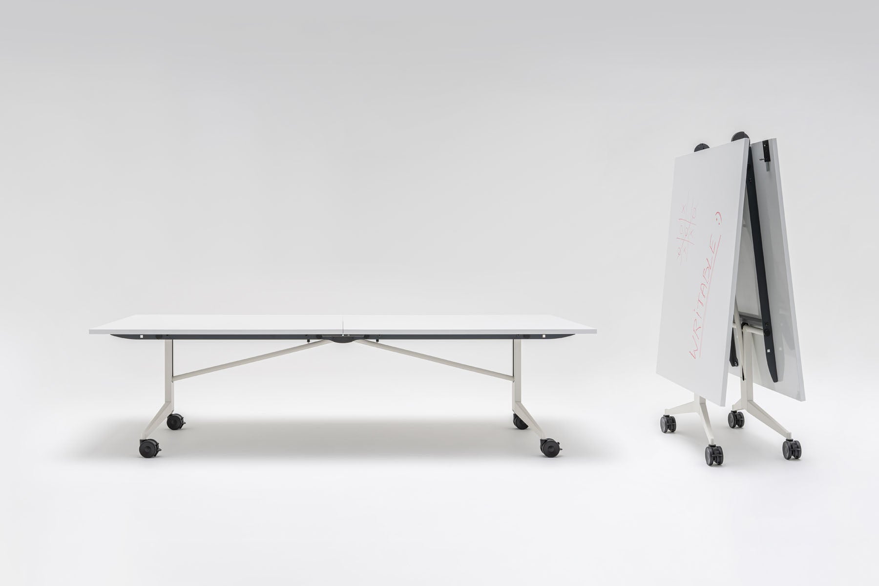 Plex ist ein kompakter Tisch, der sich ideal für Konferenzräume, Arbeitszimmer und Großraumbüros eignet. Er ist der perfekte Begleiter für Meetings, Workshops und Schulungen. Dank des ausgeklügelten Klappmechanismus lässt sich der Tisch von nur einer Person bewegen. Zusammengeklappt reduziert sich die Breite auf 50 Zentimeter, wodurch er sich leicht durch Türen transportieren, mit einem Aufzug verstauen oder platzsparend aufbewahren lässt. Plex ist mit einem Schutzmechanismus ausgestattet, der ein Einklemmen der Hand beim Ein- und Ausklappen verhindert. Das .mdd-Sortiment umfasst drei verschiedene Formen: rechteckig, rechteckig mit abgerundeten Kanten und tonnenförmig. Darüber hinaus stehen drei Oberflächen zur Auswahl: Melaminplatte, das Nano-Tech-Laminat Fenix, das sich durch hohe Kratz- und Abriebfestigkeit auszeichnet, sowie eine Whiteboard-Oberfläche, auf der Notizen direkt erstellt werden können. Das universelle Design und die monochromen Farben sorgen dafür, dass sich der Tisch harmonisch in jedes Interieur einfügt und ein ästhetisch ansprechendes Gesamtbild ergibt.
