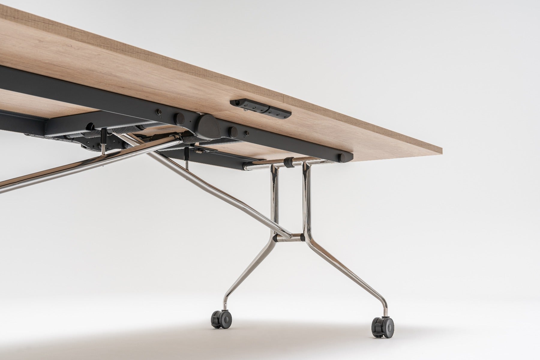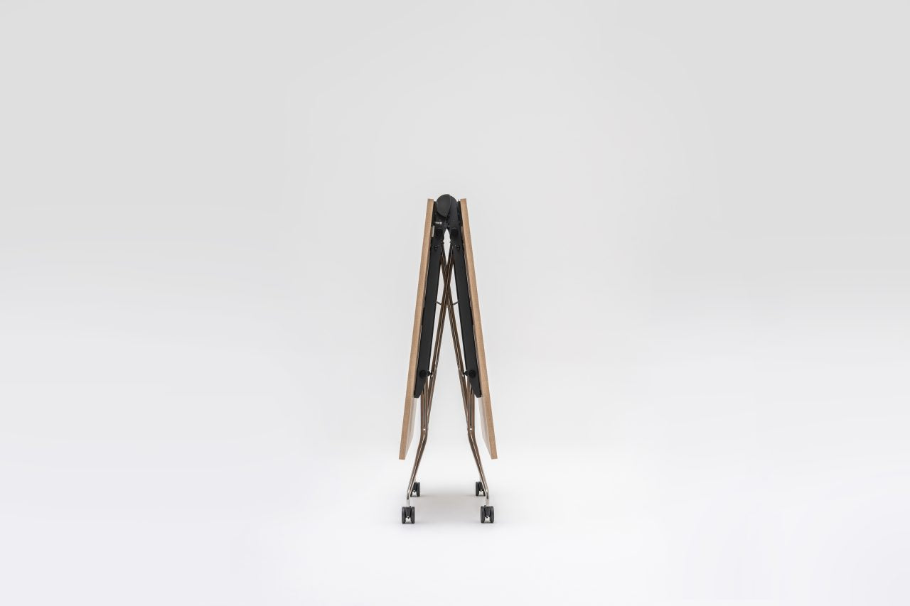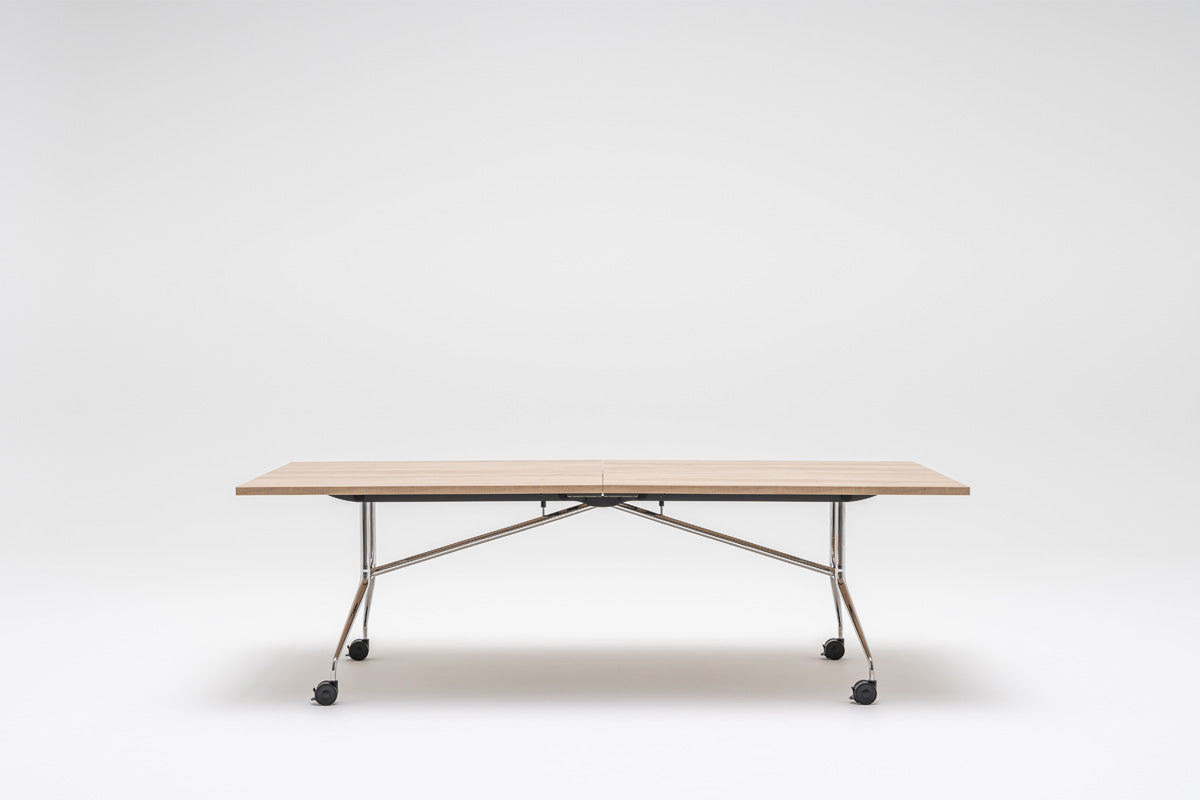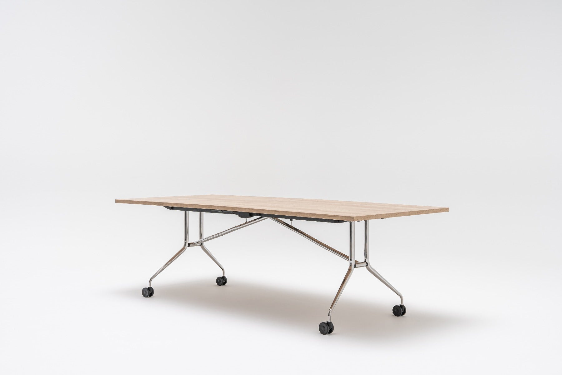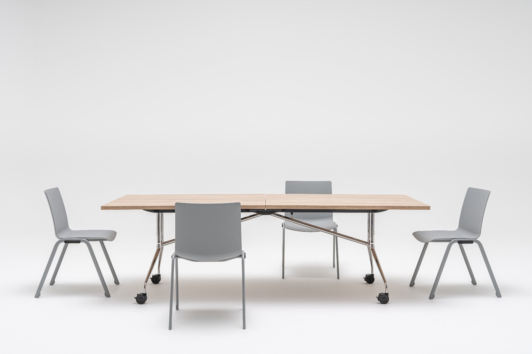 Plica ist ein kompakter Konferenztisch, der in verschiedenen Größen erhältlich ist. Er ermöglicht die Einrichtung eines ergonomischen Arbeitsplatzes für Meetings, Tagungen und Schulungen. Plica verfügt über einen Schutzmechanismus, der ein Einklemmen der Hand beim Auf- und Zuklappen verhindert. Zusammengeklappt ist der Tisch nur 40 Zentimeter breit, wodurch er sich leicht transportieren und platzsparend verstauen lässt. Plica ist mit drei Tischplattenformen erhältlich: rechteckig, rechteckig mit abgerundeten Kanten und tonnenförmig. Die Tischplatten sind wahlweise mit Melaminplatte, dem kratz- und abriebfesten Nano-Tech-Laminat Fenix oder einer abwischbaren Whiteboard-Oberfläche ausgestattet, die sich ideal für Notizen eignet. Die dezenten Farben sorgen dafür, dass sich der Tisch in jede Einrichtung einfügt, unabhängig vom jeweiligen Einrichtungsstil.