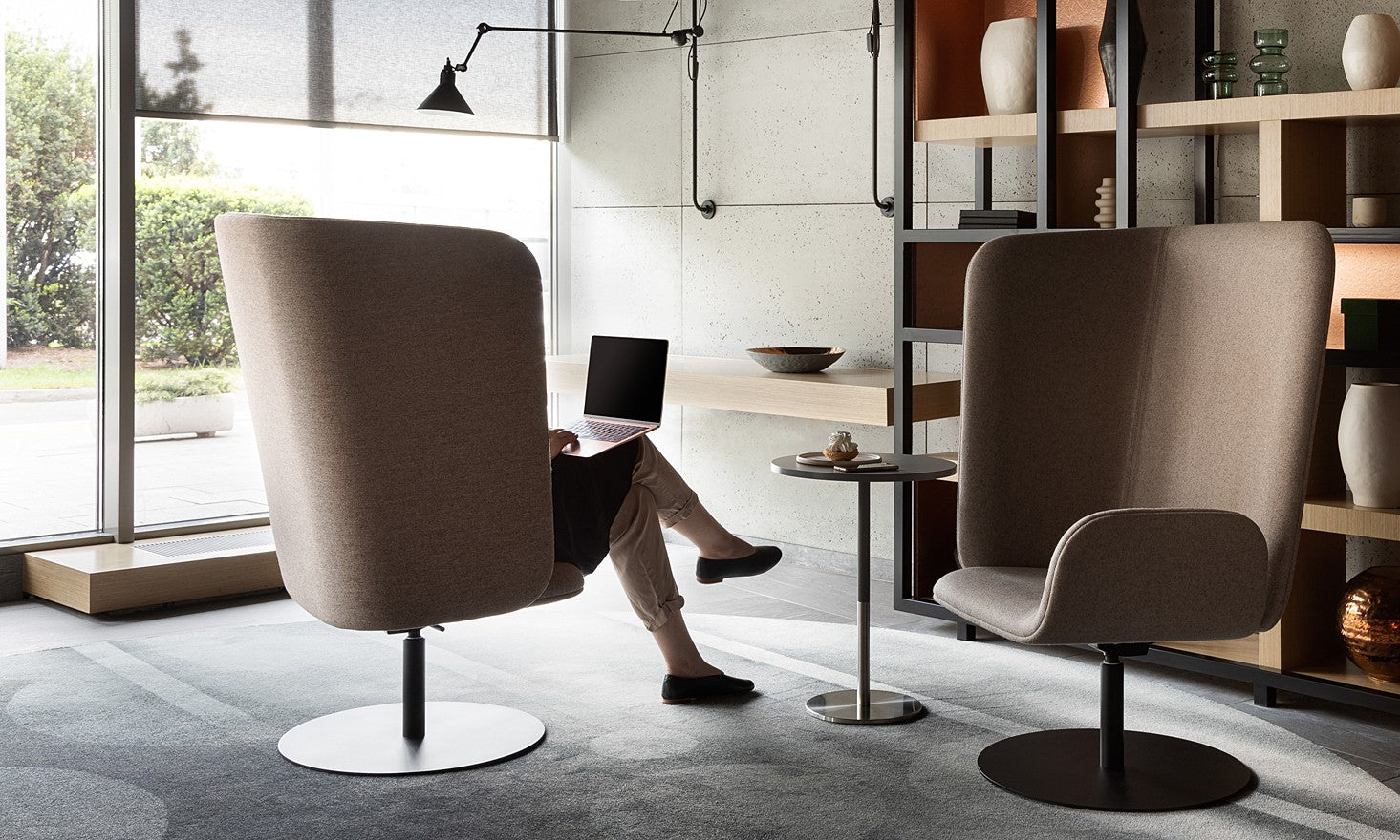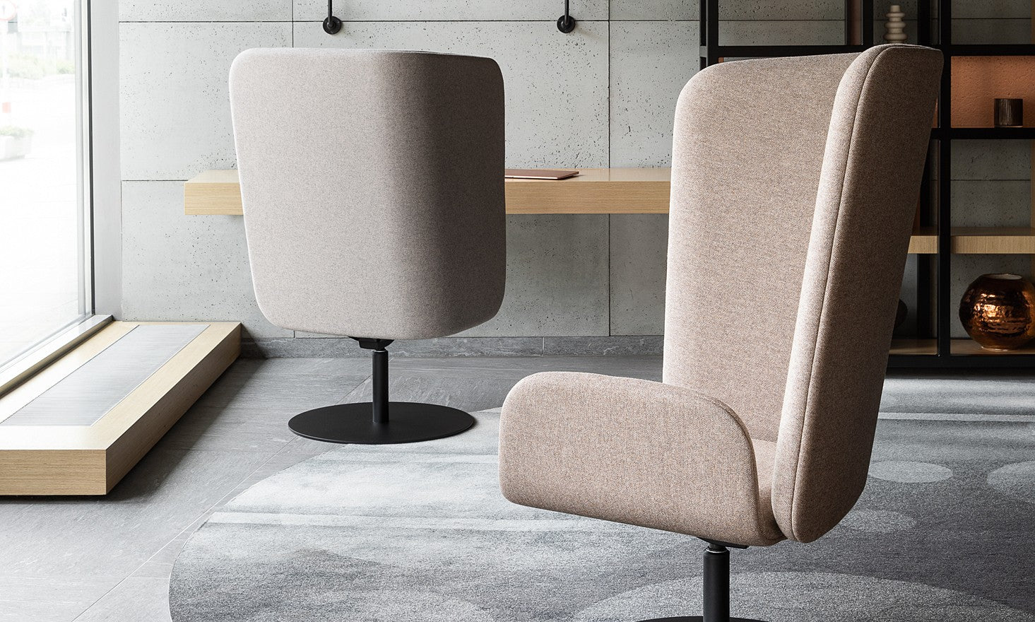 Shieldon ist ein bequemer Drehstuhl mit einer einzigartigen Form, der sich perfekt eignet, um in offenen Raumkonzepten individuellen Freiraum zu schaffen.