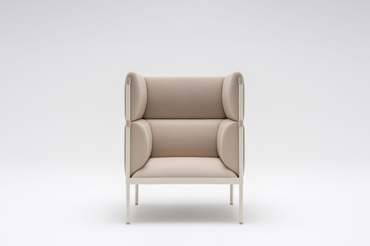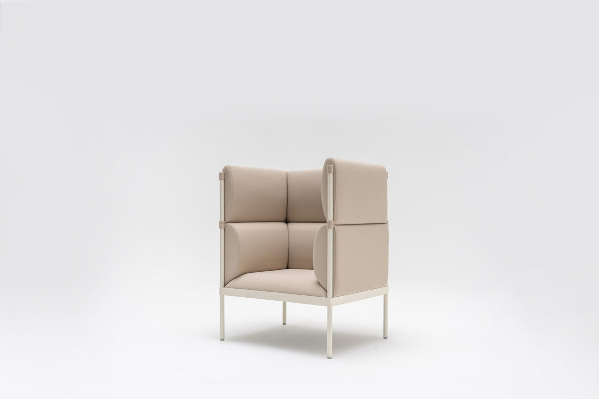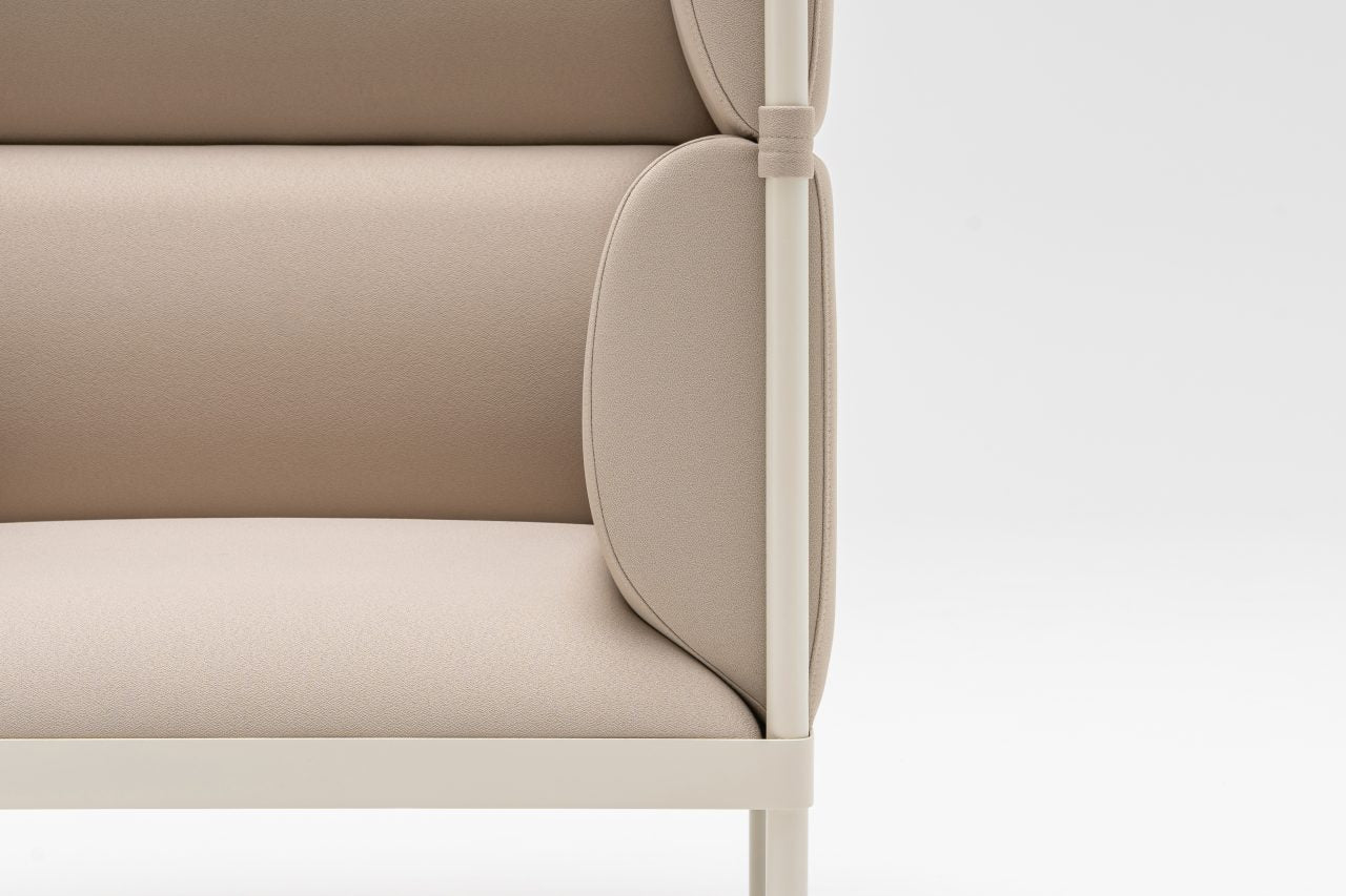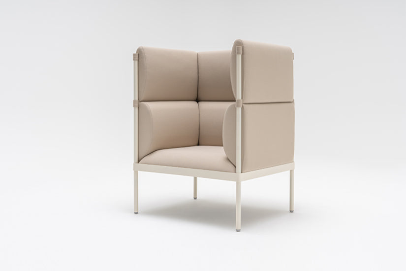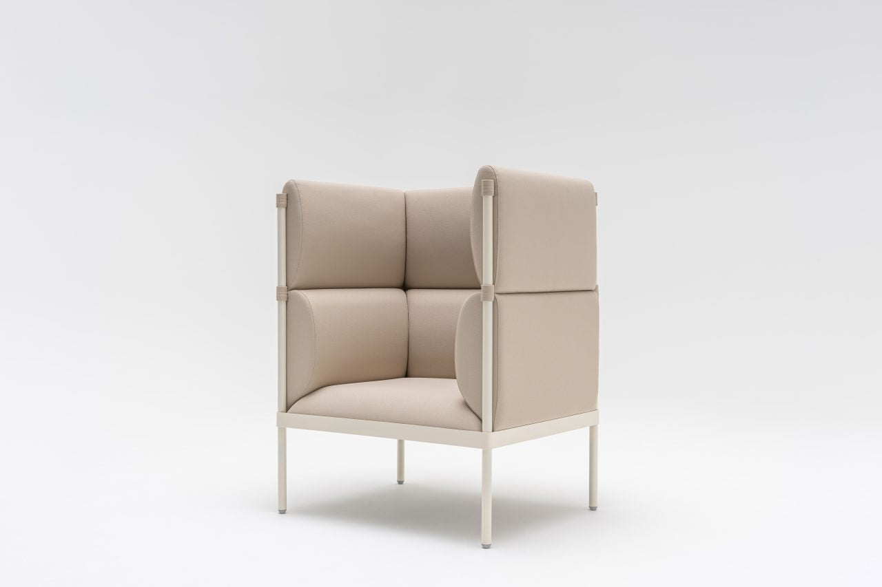 Der Hochlehner-Sessel Stilt bietet eine komfortable und private Sitzgelegenheit. Seine erhöhte Rückenlehne vermittelt ein Gefühl der Geborgenheit und eignet sich perfekt für konzentriertes Arbeiten oder entspanntes Entspannen im Büro oder in der Lounge. Das Design, wie auf dem Bild zu sehen, zeichnet sich durch klare Linien und eine massive, gepolsterte Form aus, die von sichtbaren Beinen (Stilts) getragen wird und so moderne Ästhetik mit einladendem Komfort verbindet.