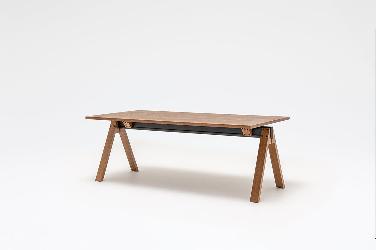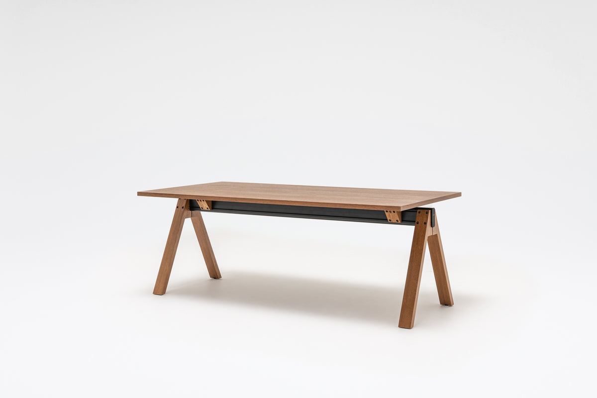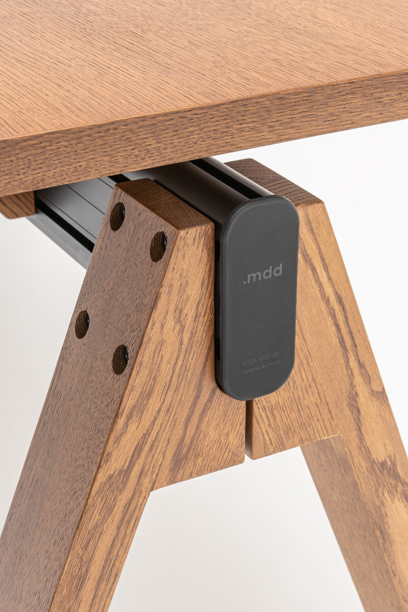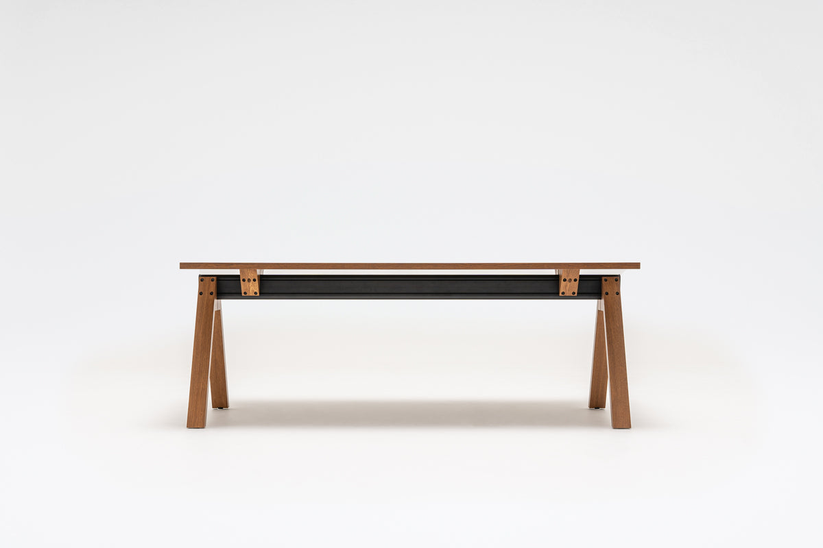 Bei den Viga-Schreibtischen verschmelzen die rohen, industriellen Linien des Aluminiumkerns und das warme und freundliche Holz der Arbeitsplatte oder der Beine zu einer harmonischen Einheit.