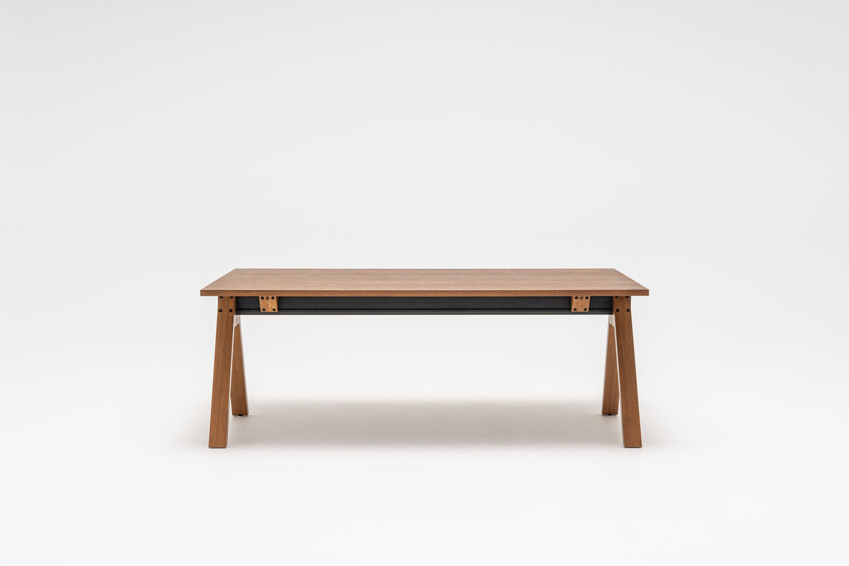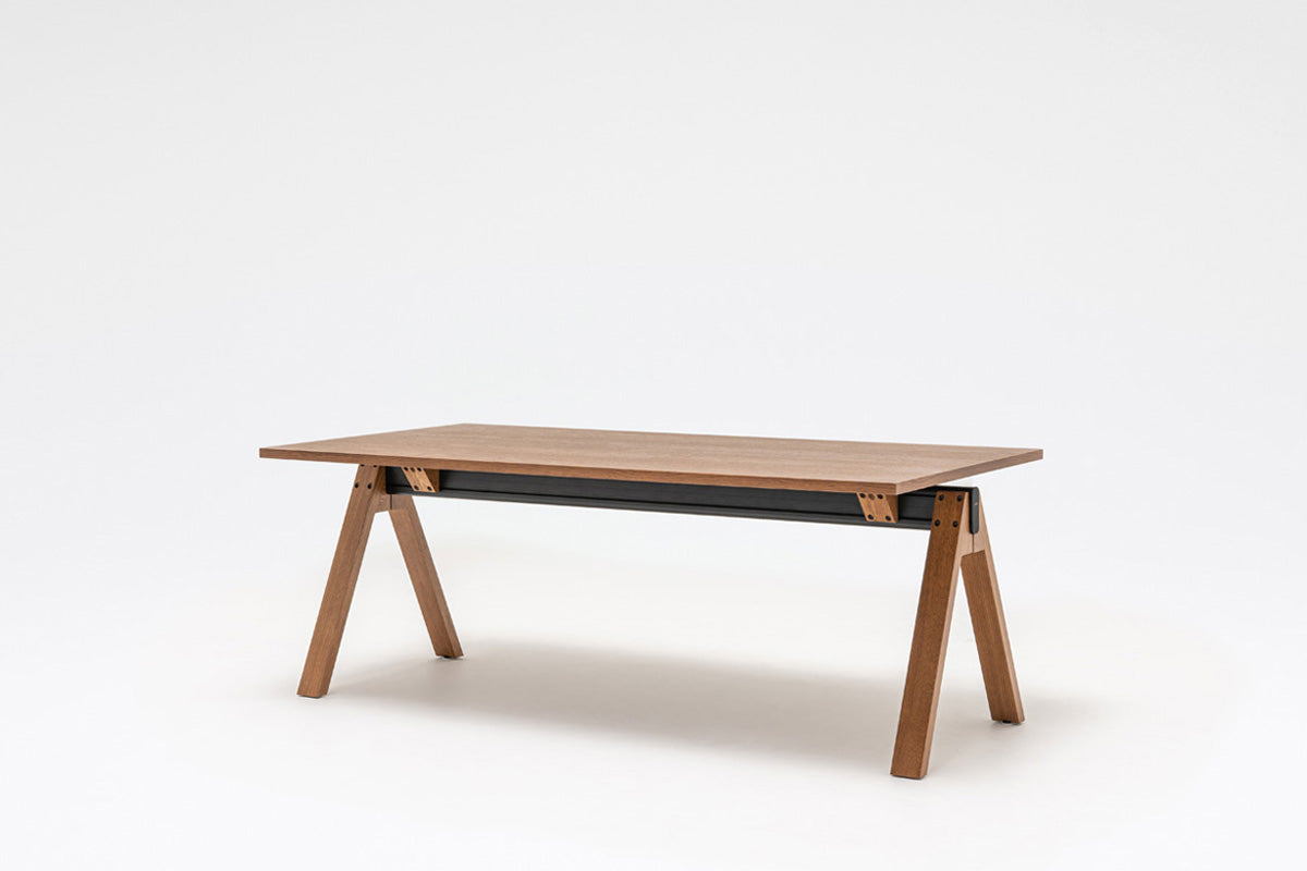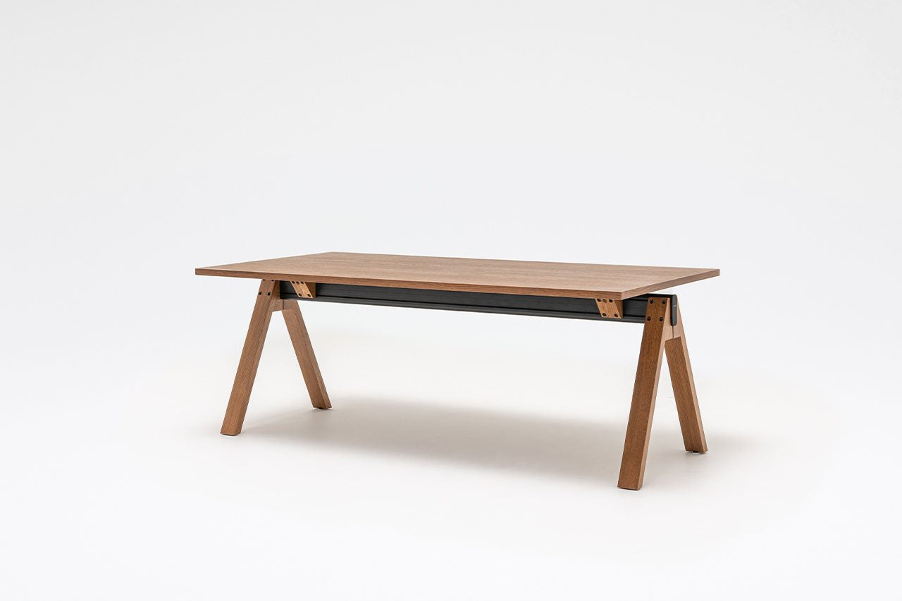 Bei den Viga-Schreibtischen verschmelzen die rohen, industriellen Linien des Aluminiumkerns und das warme und freundliche Holz der Arbeitsplatte oder der Beine zu einer harmonischen Einheit.