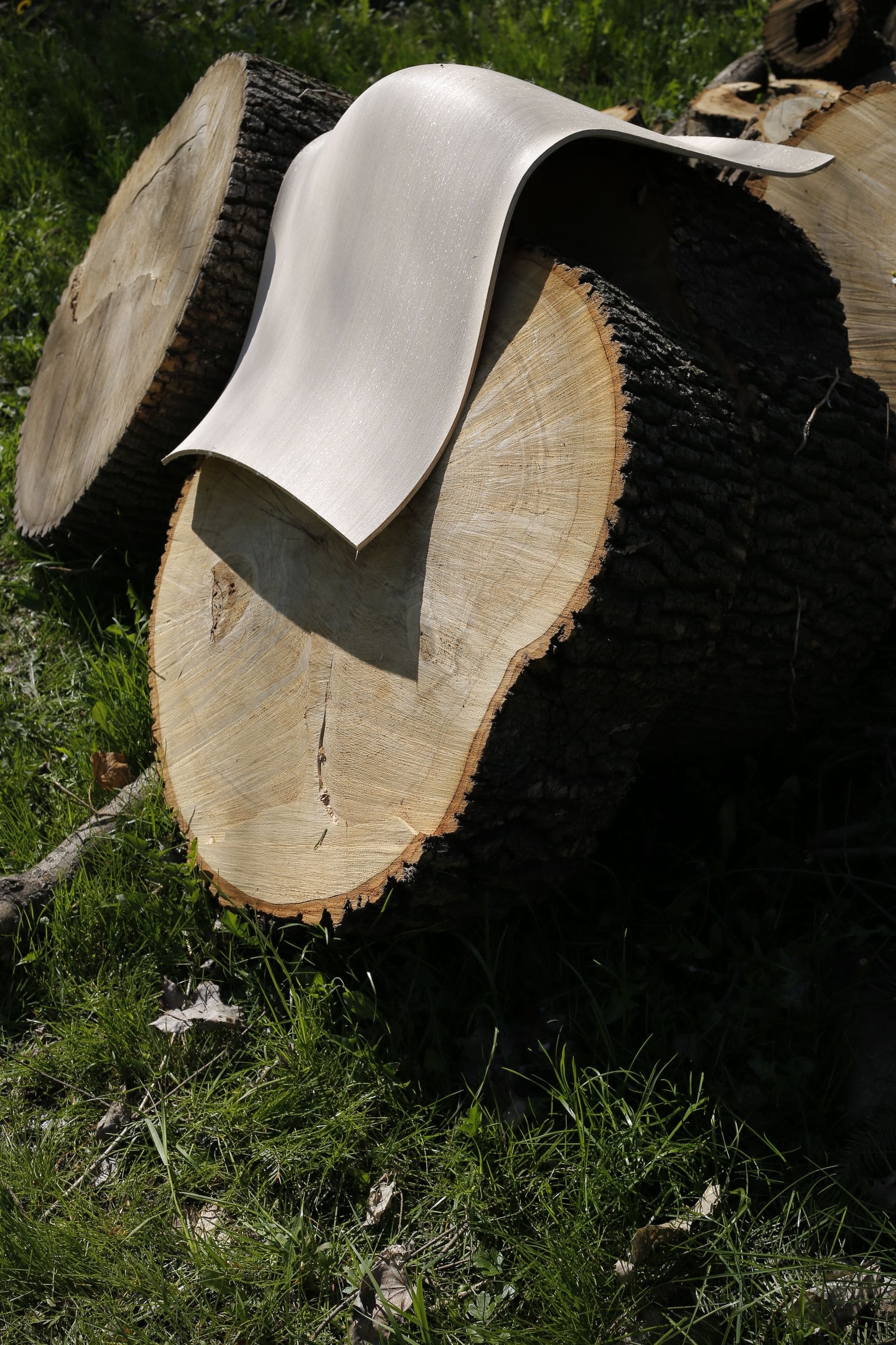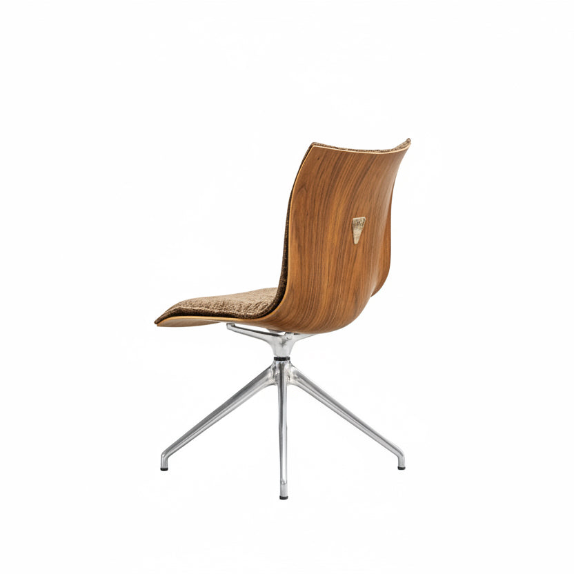Die aus Naturfurnier gefertigte Schale, hergestellt im „Reduce“-Verfahren, nutzt Holzressourcen effizient durch die Verwendung kürzerer Furnierfragmente. Das Modell ist optional mit einem zusätzlichen Polsterkissen erhältlich. Das polierte Vier-Stern-Fußkreuz aus Aluminium unterstreicht die Leichtigkeit der Form und gewährleistet Langlebigkeit.