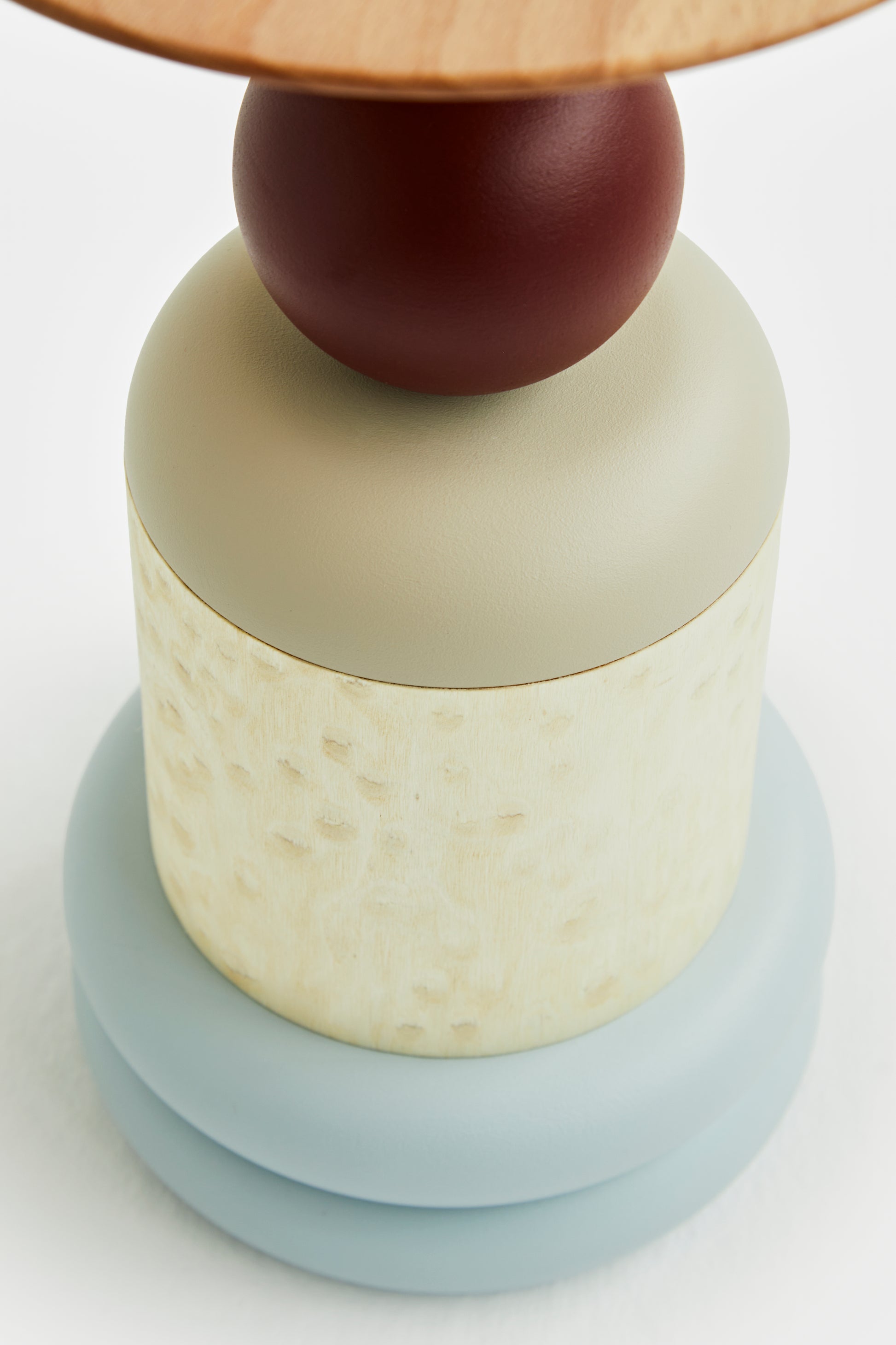 Jeder der fünf Totems hat eine andere Größe, was seinen individuellen Charakter unterstreicht. Während die Zylinder, die die Achse der Totems bilden, ein Gefühl von rotierender Energie erzeugen, lösen sich die kunstvoll gestalteten Formen, die an Kreisel und Trompeten erinnern, deutlich von der massiven Struktur. Ihre kreisförmige Bewegung verweist auf die Drehbewegung der Drechselbank, mit der sie gefertigt wurden. Gleichzeitig erfüllen ihre Farben den Raum mit Leben und Dynamik, und die Totems werden zu charmanten Blickfängen mit einer Vielfalt an Ausdrucksmöglichkeiten – von ruhig und zurückhaltend bis hin zu lebendig und dynamisch.