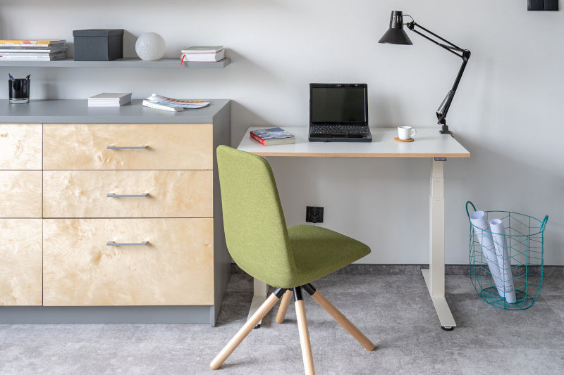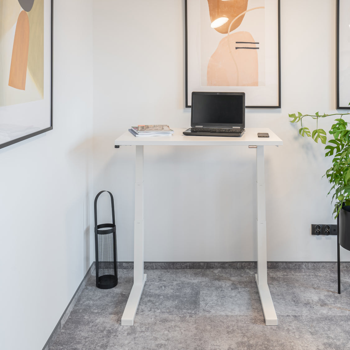 The Compact Desk offers electrical height adjustment from 575 mm to 1225 mm, providing an ergonomic solution for a modern workspace. Its compact design is shown in the accompanying image, making it suitable for various office layouts.