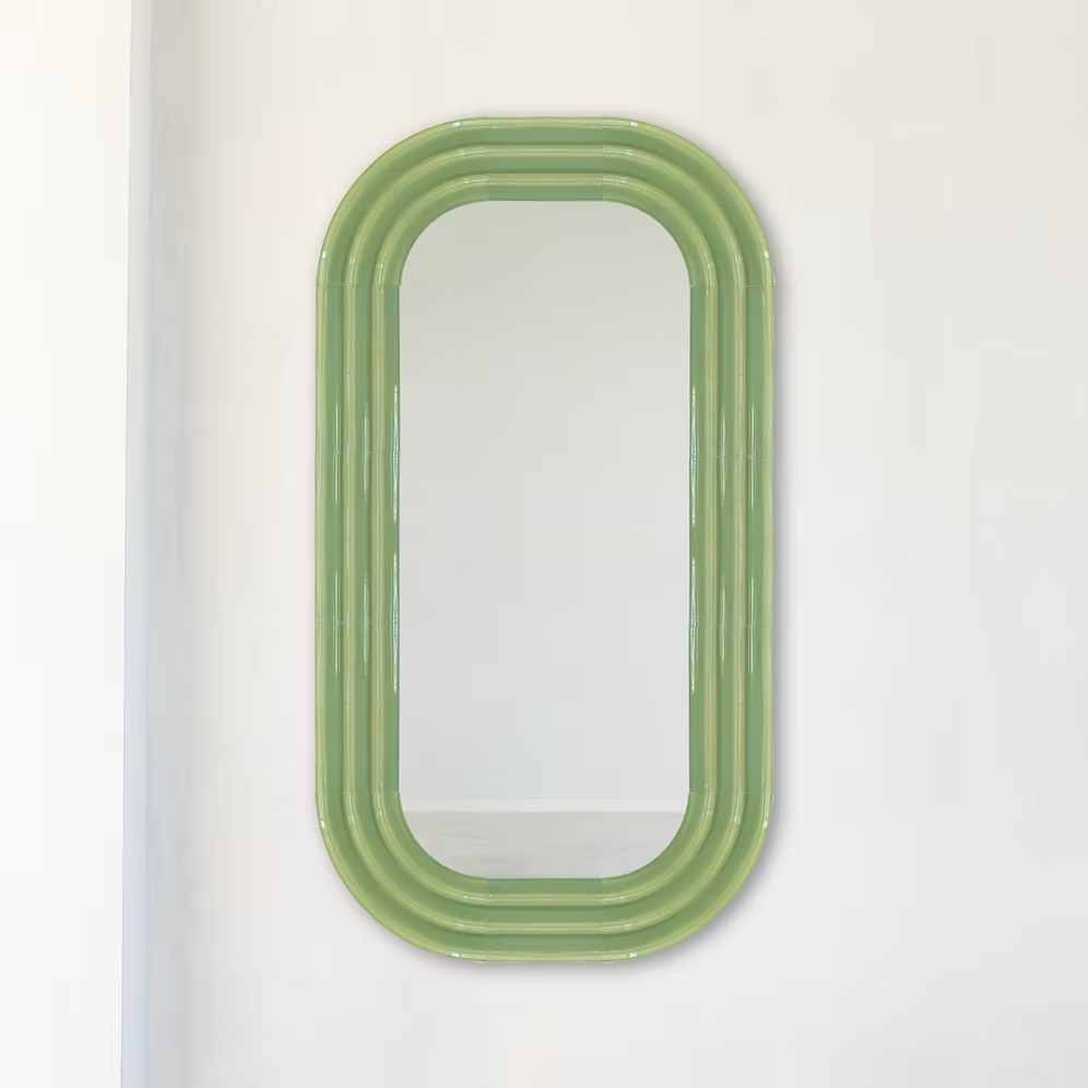 In the ELO mirrors collection, Pani Jurek explores ceramics and the reflective potential of mirror surfaces. Inspired by the ripple effect on water, the sculptural frames mimic the expanding circles that appear after a splash. The ceramic elements are airbrushed glazed by hand, which gives them a unique, artisanal character. The name “ELO” is a playful nod to Polish slang for “hello,” referring to the greeting between you and your reflection in the mirror.