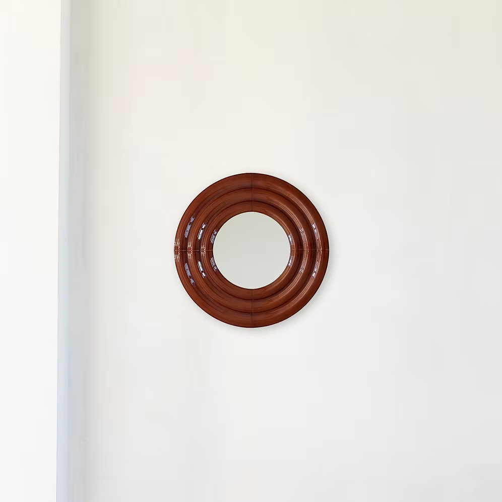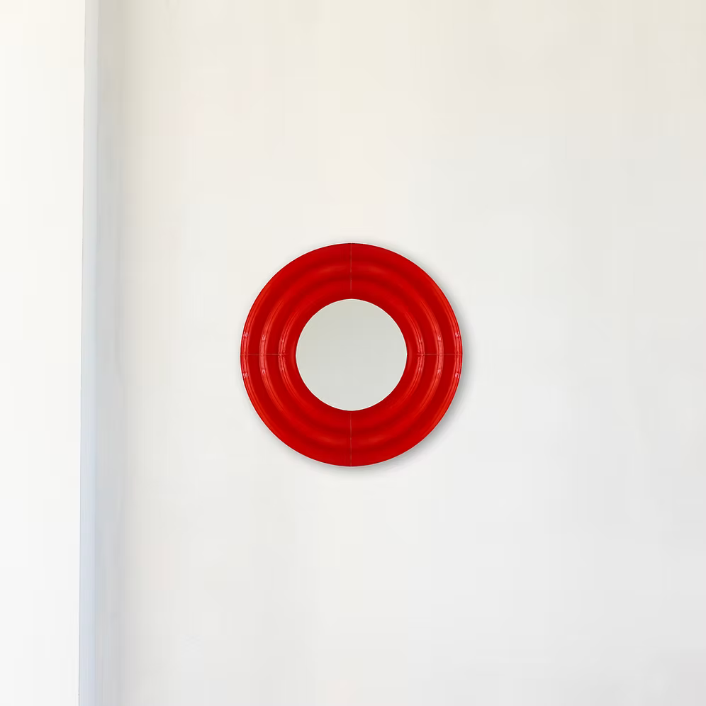 In the ELO mirrors collection, Pani Jurek explores ceramics and the reflective potential of mirror surfaces. Inspired by the ripple effect on water, the sculptural frames mimic the expanding circles that appear after a splash. The ceramic elements are airbrushed glazed by hand, which gives them a unique, artisanal character. The name “ELO” is a playful nod to Polish slang for “hello,” referring to the greeting between you and your reflection in the mirror.