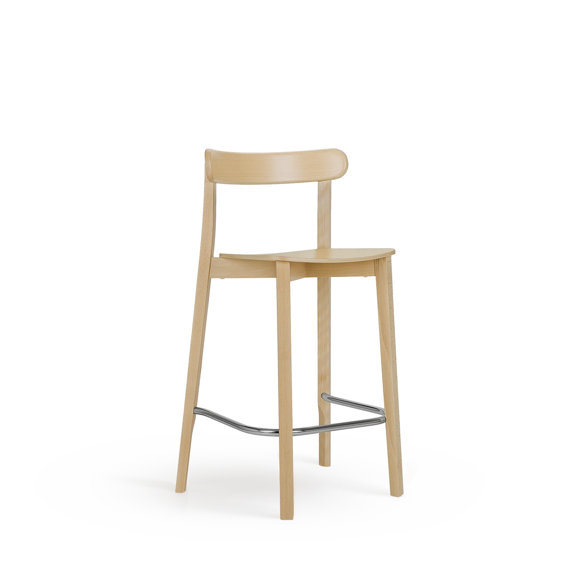 Made entirely of beechwood — with a plywood seat and all other components crafted from solid wood. The stable construction and gently curved legs provide comfort, while the metal footrest adds support and highlights the modern character of the piece.
