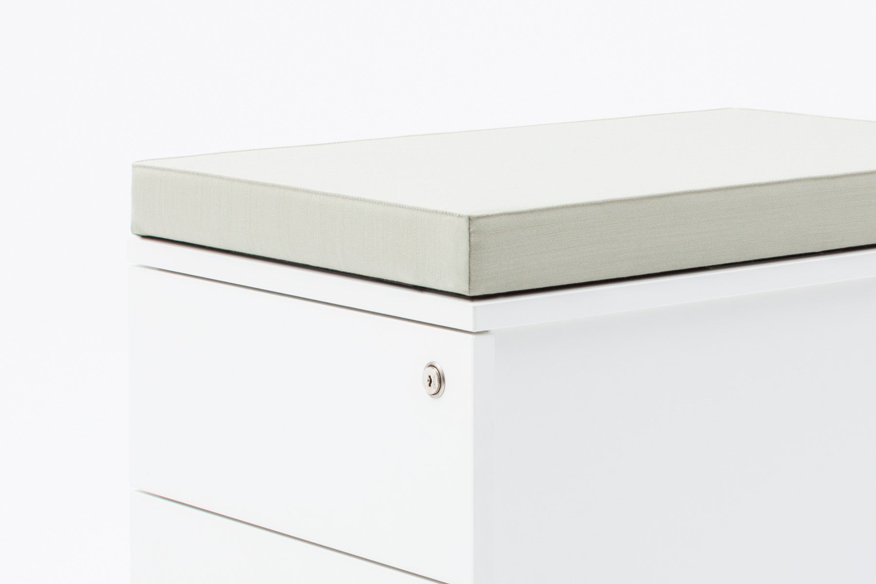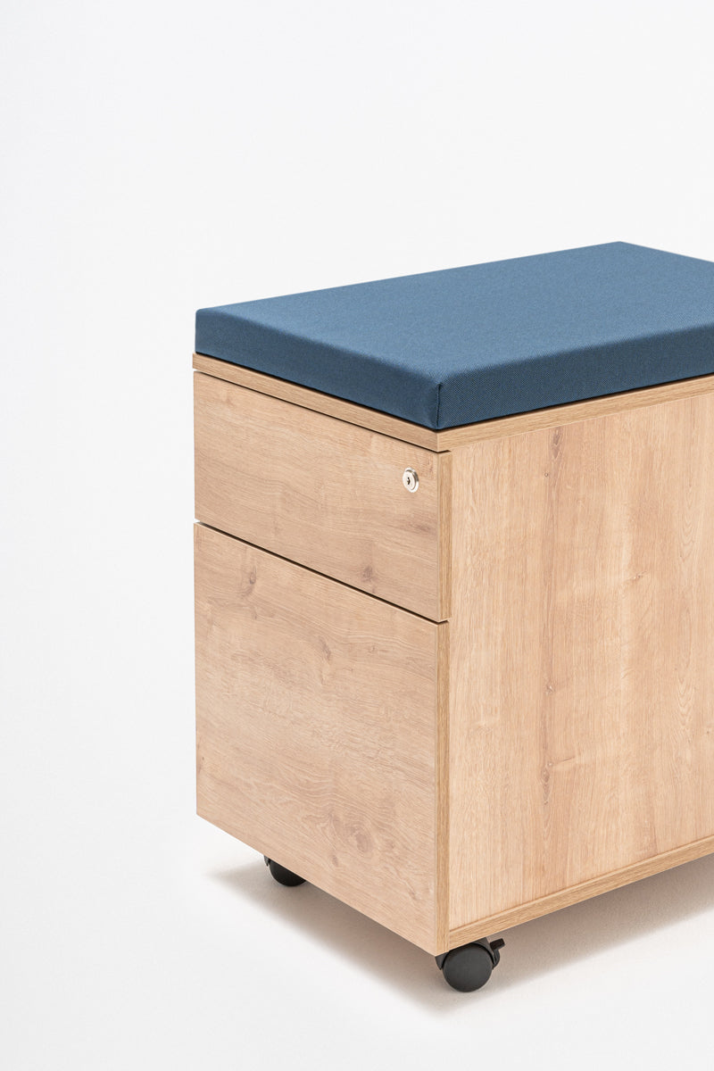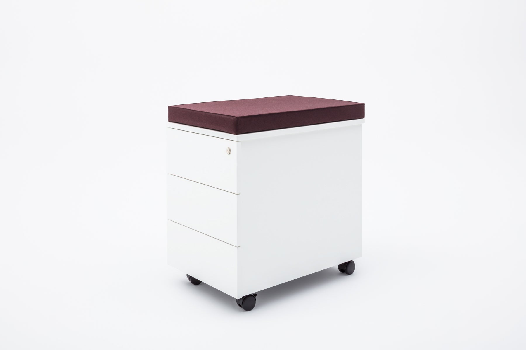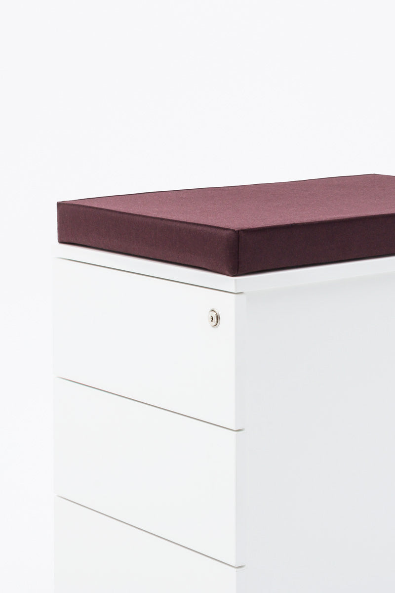 This cushion is designed to fit on top of a pedestal, transforming it into a comfortable, temporary seat. It adds functionality and a soft touch to your mobile or stationary storage unit.