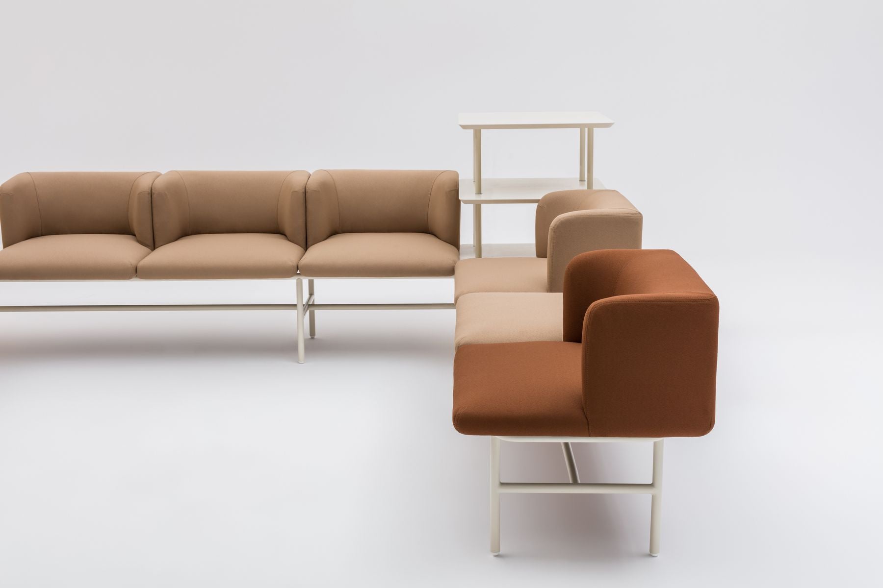 The Agora seating system offers a versatile and modern solution for various spaces. Its design promotes collaboration and comfort, making it suitable for both casual lounging and more structured interactions in office environments, public areas, or waiting rooms.