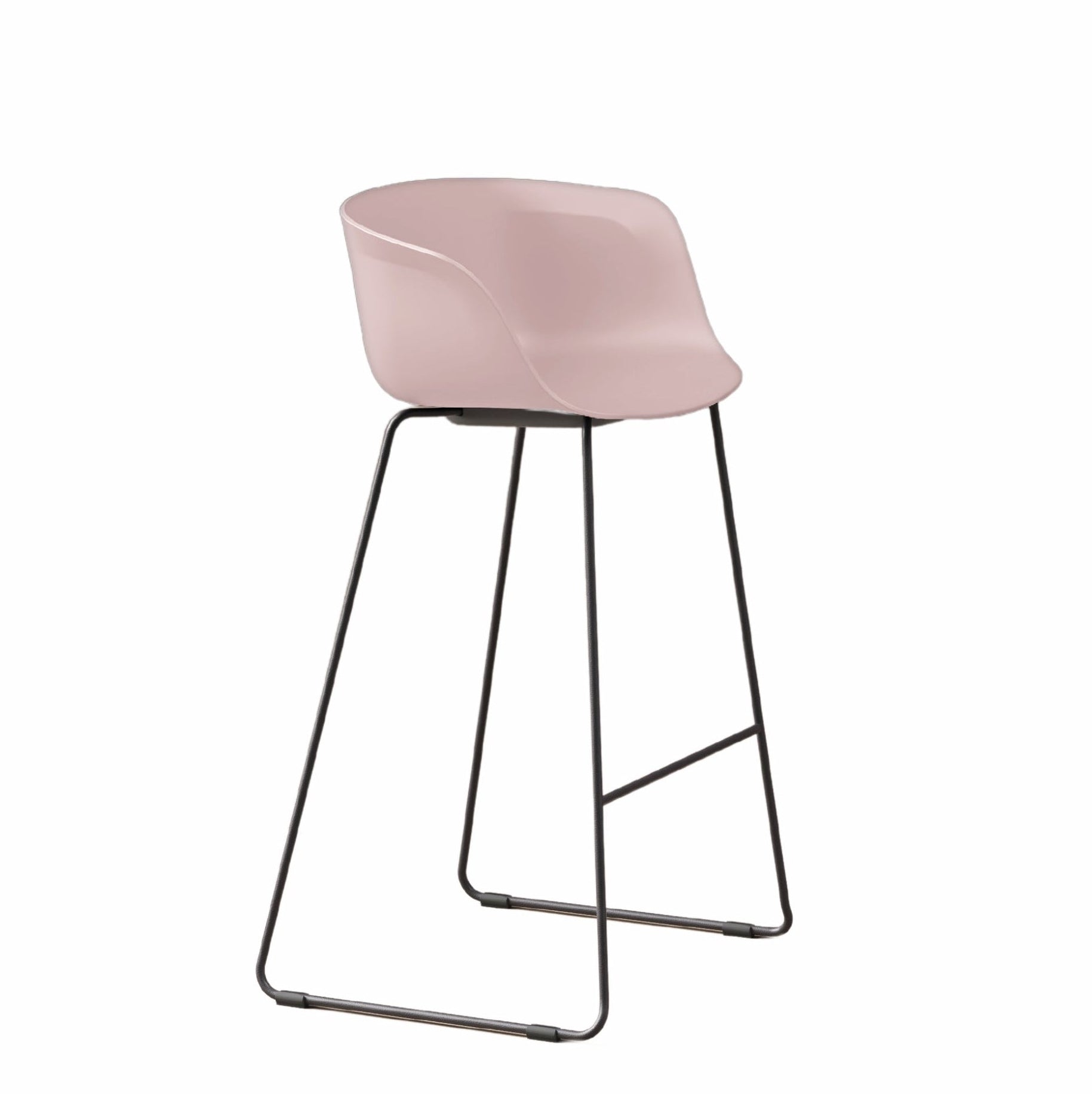 VANK_LORIA is a minimalist barstool resting on a metal sled frame with a footrest. The core structure combines lightness and durability. The comfortable bucket-type seat encloses the user on three sides and comes with armrests.