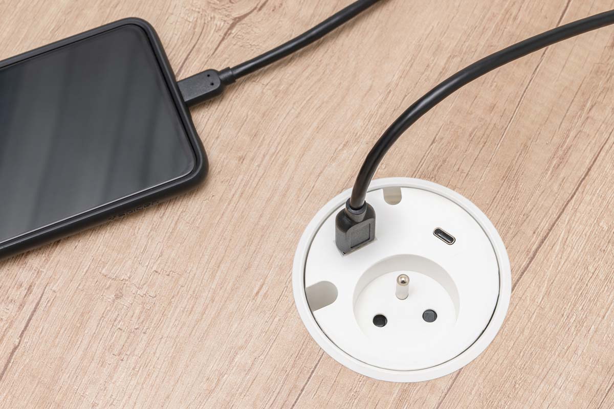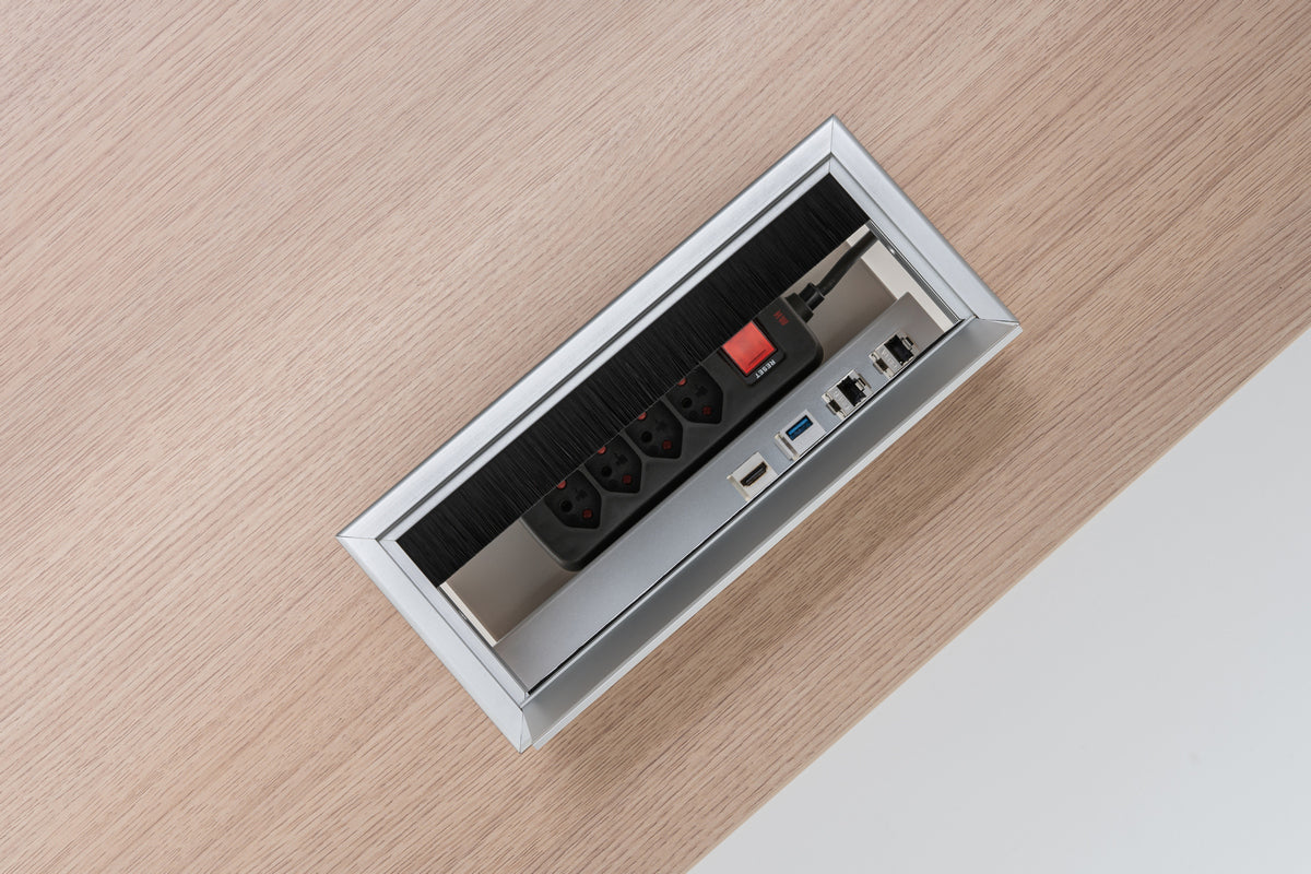 Never look for the power socket again. Installed in the worktop of the desk or the table, mediaboxes mean having the electricity outlet always on hand. Thus, they will make meetings and presentations much easier and help keep the worktop tidy, translating to a better task management. Our mediaboxes are equipped with 230V power sockets (matching the chosen electrical system), USB chargers and RJ45 ports. They are designed to fit operative and executive desks and conference tables. Due to that, they can improve the functionality of spaces arranged for various types of work, from individual focus and meetings up to common brainstorming.