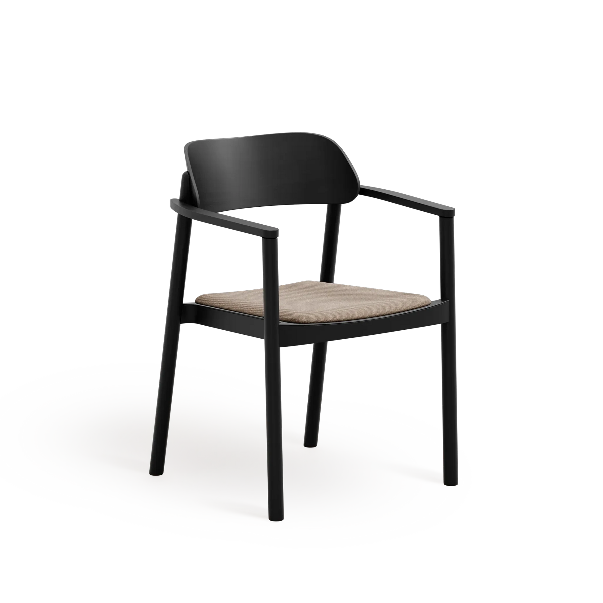 Nimm B-4590 with armrests and an upholstered seat is a proposal for those who value comfort and aesthetic coherence within an interior. Made of solid beechwood, it combines the natural beauty of the material with the softness of upholstery, which adds a welcoming character and enhances everyday comfort. The integrated armrests flow seamlessly from the structure, giving the chair a harmonious and elegant silhouette.