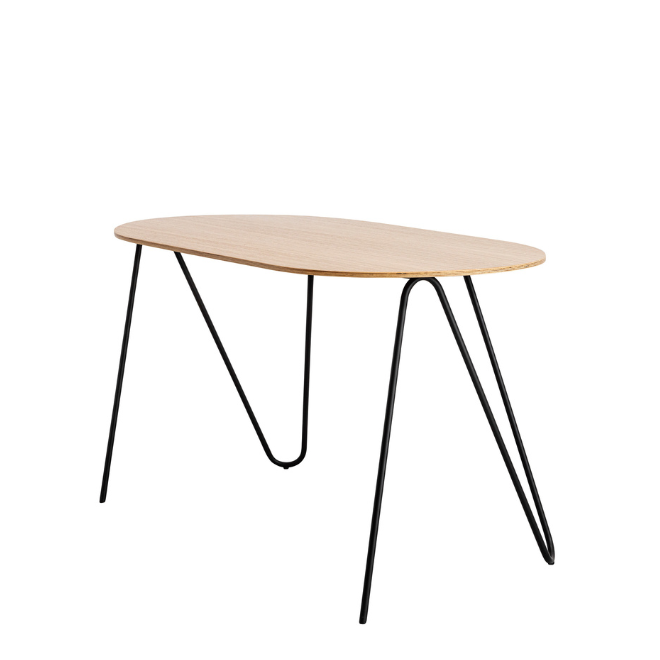 VANK_PEEL is an oval desk with a depth of 65 cm and a length of 125 cm. Together with the PEEL chair, it makes a perfect solution for home or corporate office environments as well as hotel rooms. The desk top can be made of heavy-duty SwissCDF board or of plywood in natural veneer. Its base is a distinctive sinuous powder coated steel frame.
