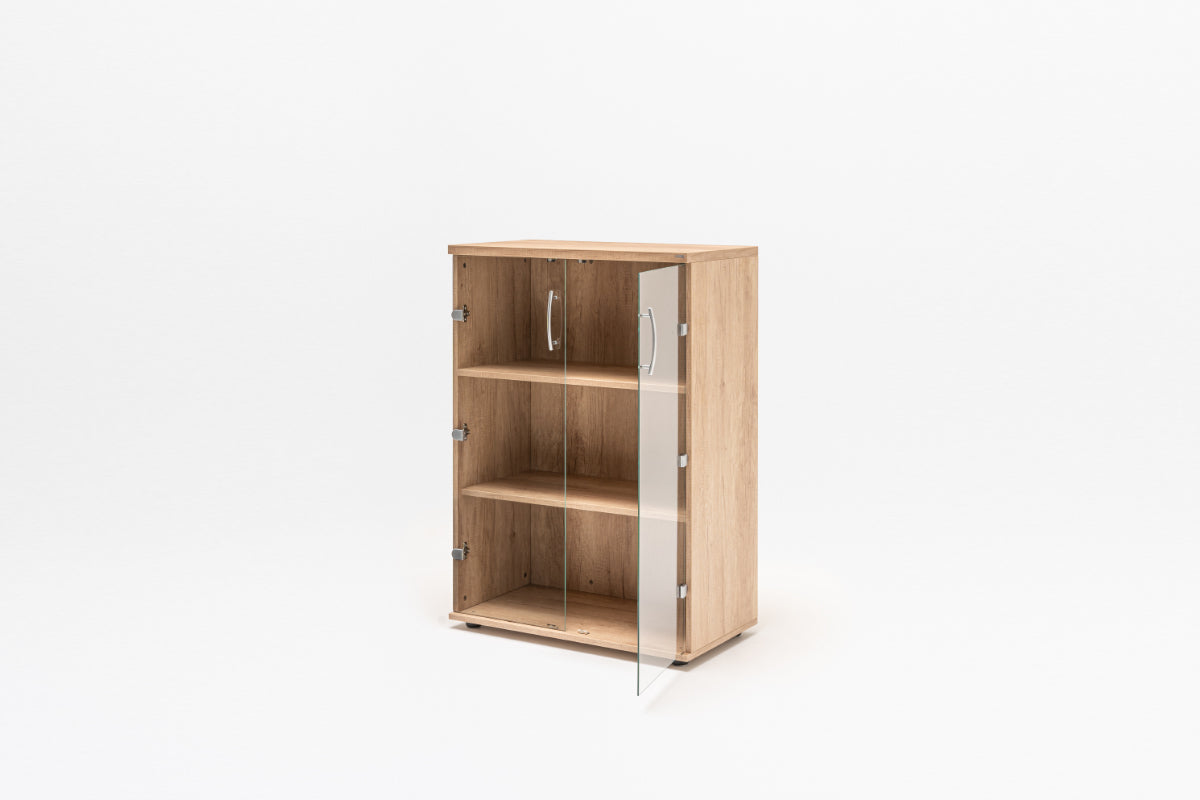 Thanks to its glass doors, the Quando cabinet allows the user to keep the space tidy and at the same time showcase chosen objects. Minimal design of the cabinet and it sophisticated details provide it with elegance, whilst the glass front makes the construction appear lighter. Yet, it is still solid and capacious. A patent lock guarantees the safety of stored items. Just like the whole Quando series, the cabinet helps enhance the professional image of the company. The collection is based on a modern approach to elegance, fitting traditional offices and modern workspaces and other interiors.