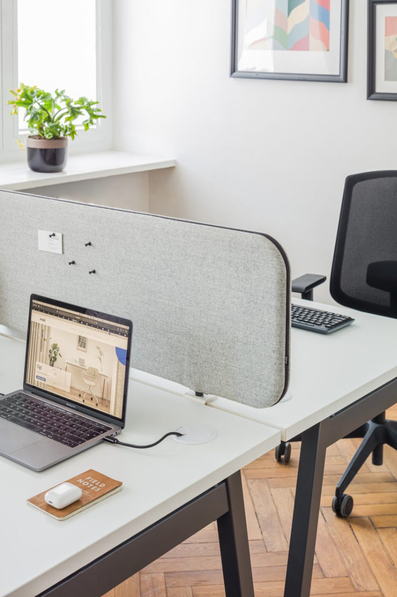 Enhance your workspace with the Sonic acoustic desk screens. These panels are designed to reduce noise and provide privacy, contributing to a more focused and comfortable office environment, as suggested by the image showing the screens mounted on desks.