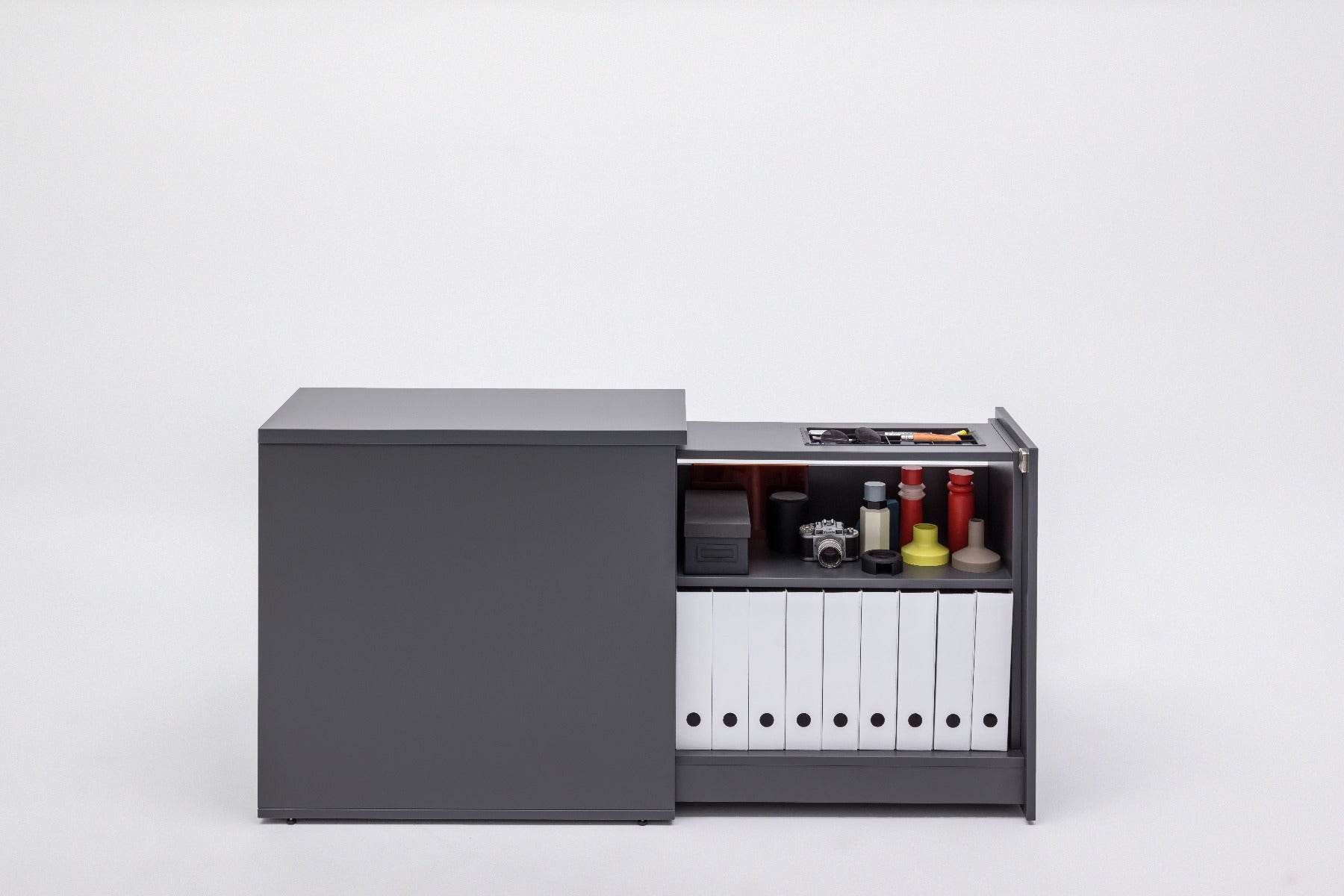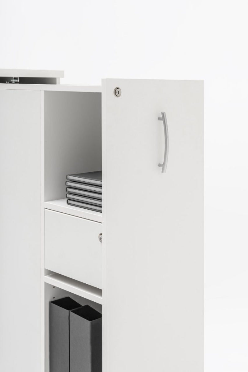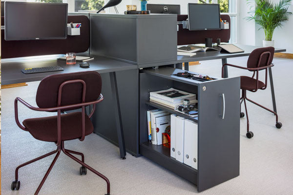 Increase the storage possibilities of your office with the cargo pedestal. The pull-out cabinet, equipped with a few shelves or drawers and practical accessories, will greatly help keep the working space tidy and organised. It provides a bigger storage capacity than usual pedestals. The user can choose which side (or both sides) the pedestal will be accessed from – thanks to that, it will perfectly fit into the arrangement of the working station. The cargo pedestal will be a functional finishing touch to the office spaces, lecture rooms, workshops, reception or even service facilities. The selected range of finishes in neutral colours and natural wood hues will enhance each interior's character, but without dominating it.