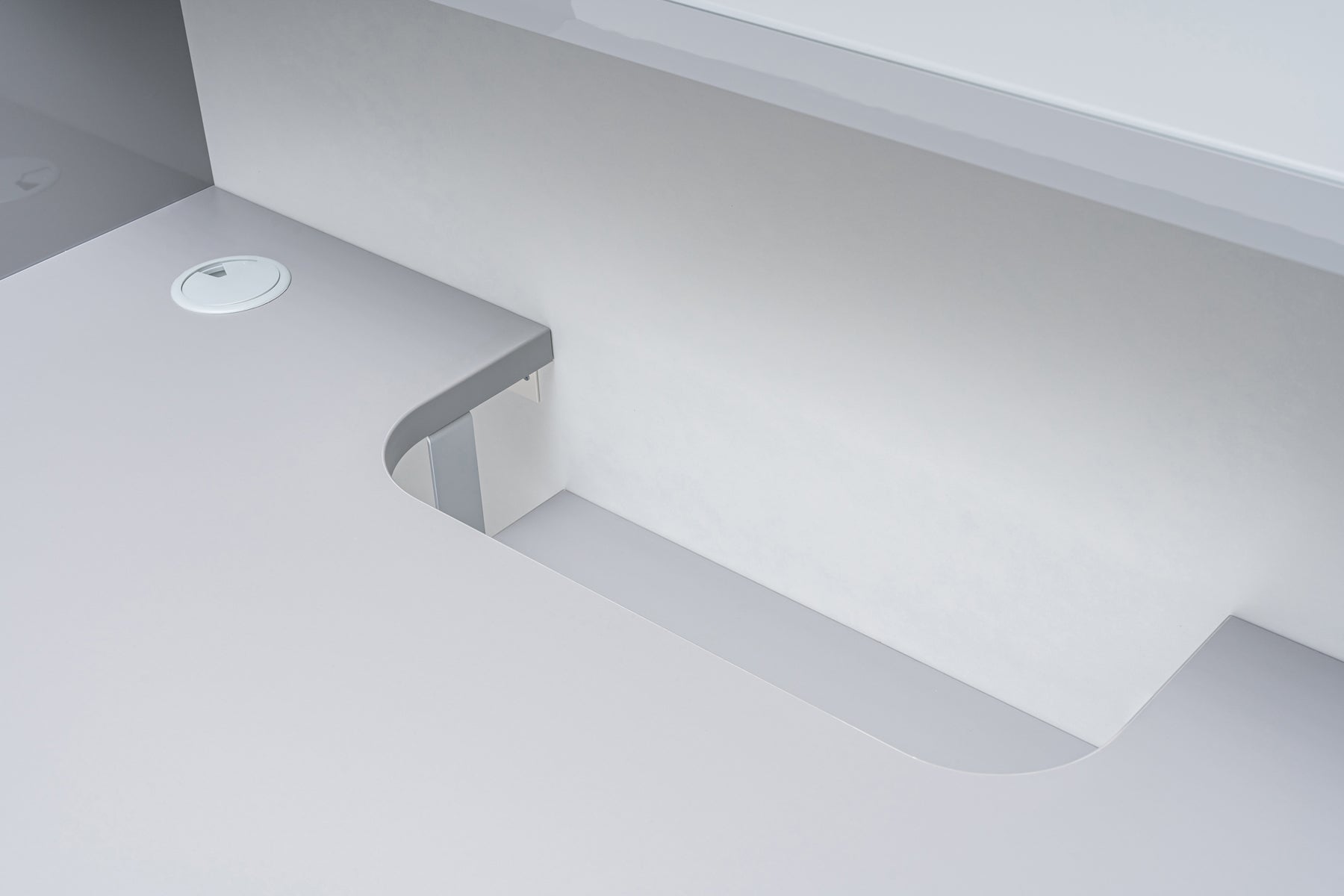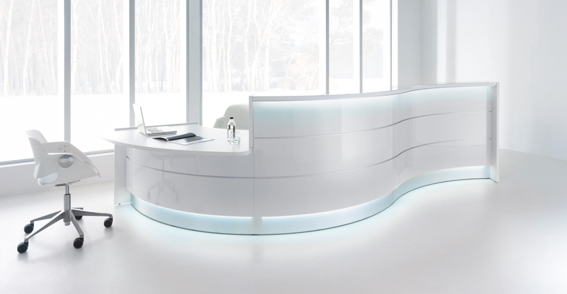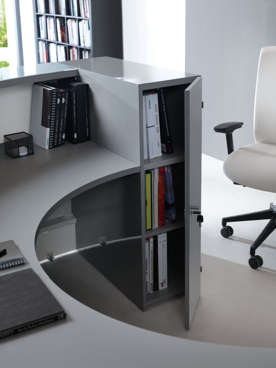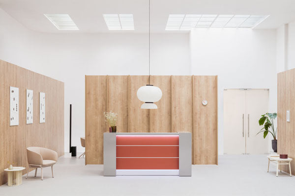 The Valde modular reception desk is a custom-designed unit for reception areas, combining elements like glass, aluminum, and high-gloss laminate in a modular construction. This allows for a wealth of shapes (straight, round, corners, and irregular) to fit various footprints and aesthetic requirements. It features a high gloss HPL front with LED lighting and is offered in a range of stylish colors, styles, and finishes, suitable for diverse settings from medical offices to corporate headquarters. A low overhang desktop is included for the convenience of disabled customers.